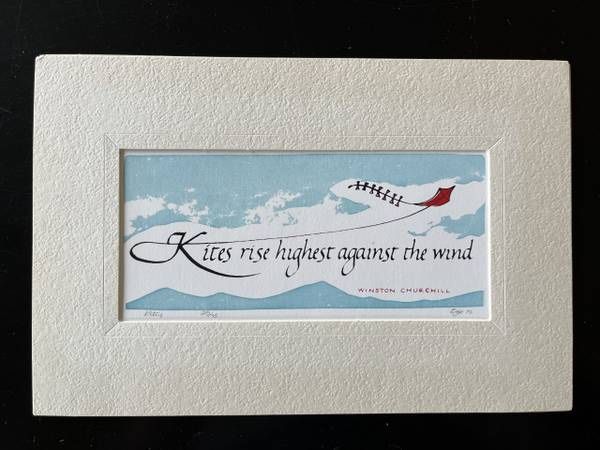 1979 "Kites fly highest against the wind" Hand Screen Print - by Jean Valerie Egle Beaverton Oregon. This quote is by Winston Churchill and is beautifully illustrated with expert calligraphy. "Original Hand Screen Print Silk Screen by Jean Egle Beaverton Ore" stamped on the back of the art piece. Signed and number 29/75 with title "Kites". In excellent condition. Has never been framed and in storage since 1979 so colors are vivid. Overall size is 9 1/2" x 6". Print is 7 1/2" x 4 3/4". Jean Valerie Egle was a local renown calligraphist and artist whose art has been shown at Portland Art Muesum.