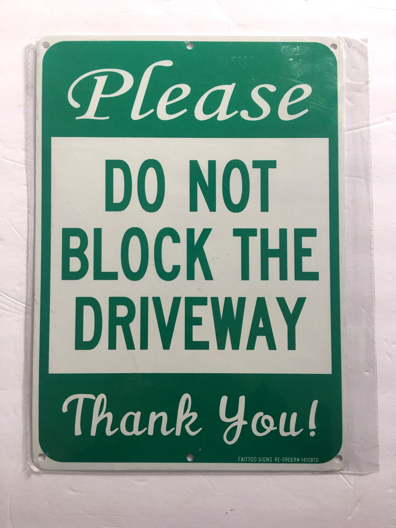 METAL SIGN * * * * * * * * * * * * Please DO NOT BLOCK THE DRIVEWAY Thank you! * * * * * * * * * * * * Size: ~ 10" x 14" (9 7/8" x 13 3/4") Faittoo Signs # 1410BTD BRAND NEW cash only please
