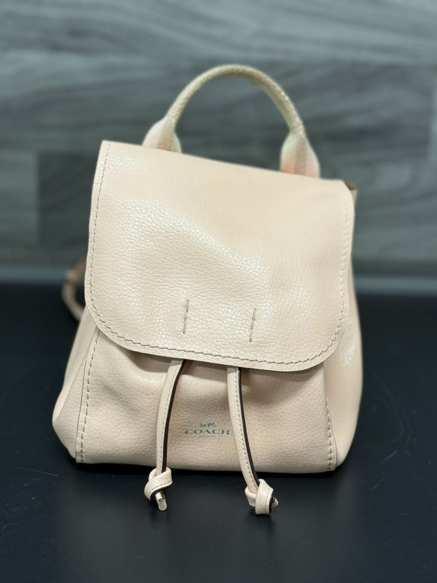 Coach Derby backpack model A1821-F58919 in light pink pebbled leather, approx 8" x 10" x 4". Compact drawstring design with flap closure and top handle. Authentic. Leather exterior is in good condition with normal wear inside. Stylish everyday mini backpack.
