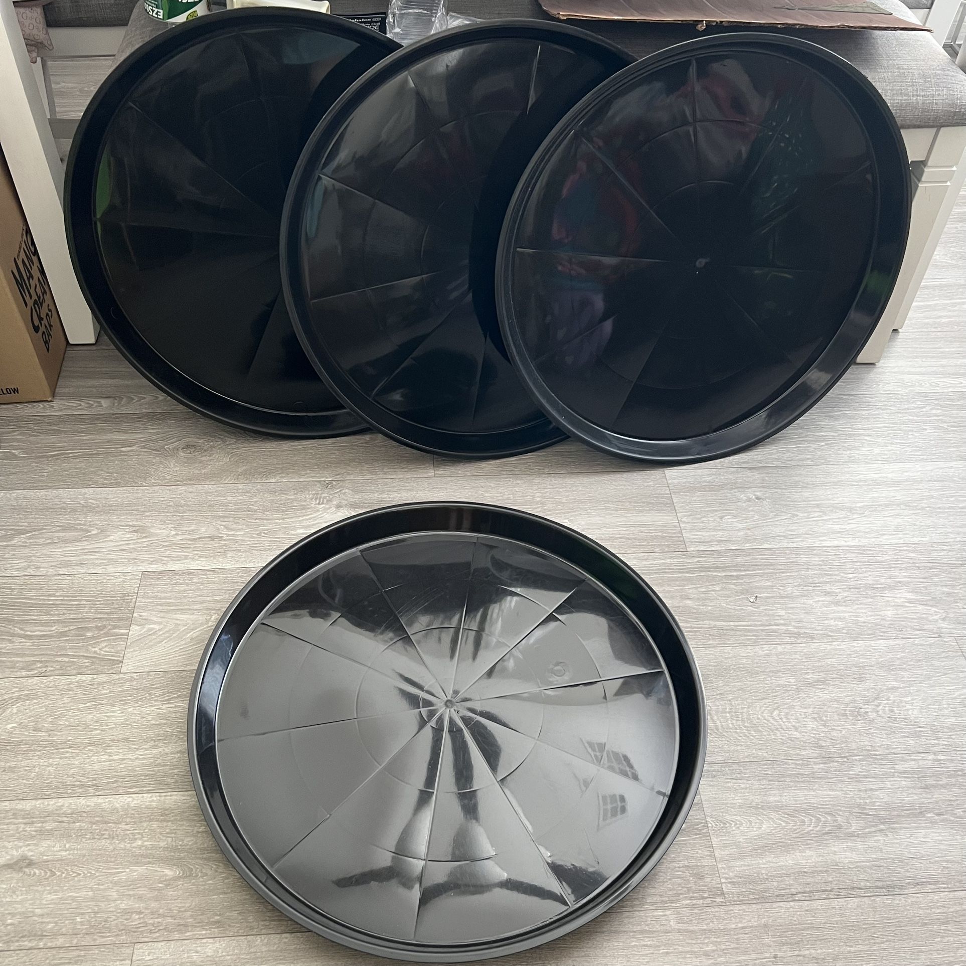 Click ๐๐ผ SEE MORE๐๐ผ for full description. Set of 4 Plastic Plant Saucers. Thick & Heavy Duty. Made of quality PP material, which is strong and sturdy. It will not deform after long term exposure; They are durable enough to hold heavy pots, suitable for pelvic floor flower pots, such as ceramic flower pots. Each saucer measures 25โ in diameter & 1 3/4โ deep. Leakproof Design: Each tray is designed with an appropriate height, which can collect excess water and soil, provide protection between the saucer and the floor or furniture, so you don't have to worry about water spilling or ruining furniture. Black in color. No holes Brand new! *Comes from a smoke free home *Cash only *No returns or exchanges - All sales final #gardening #plantssucers #plantaccessories