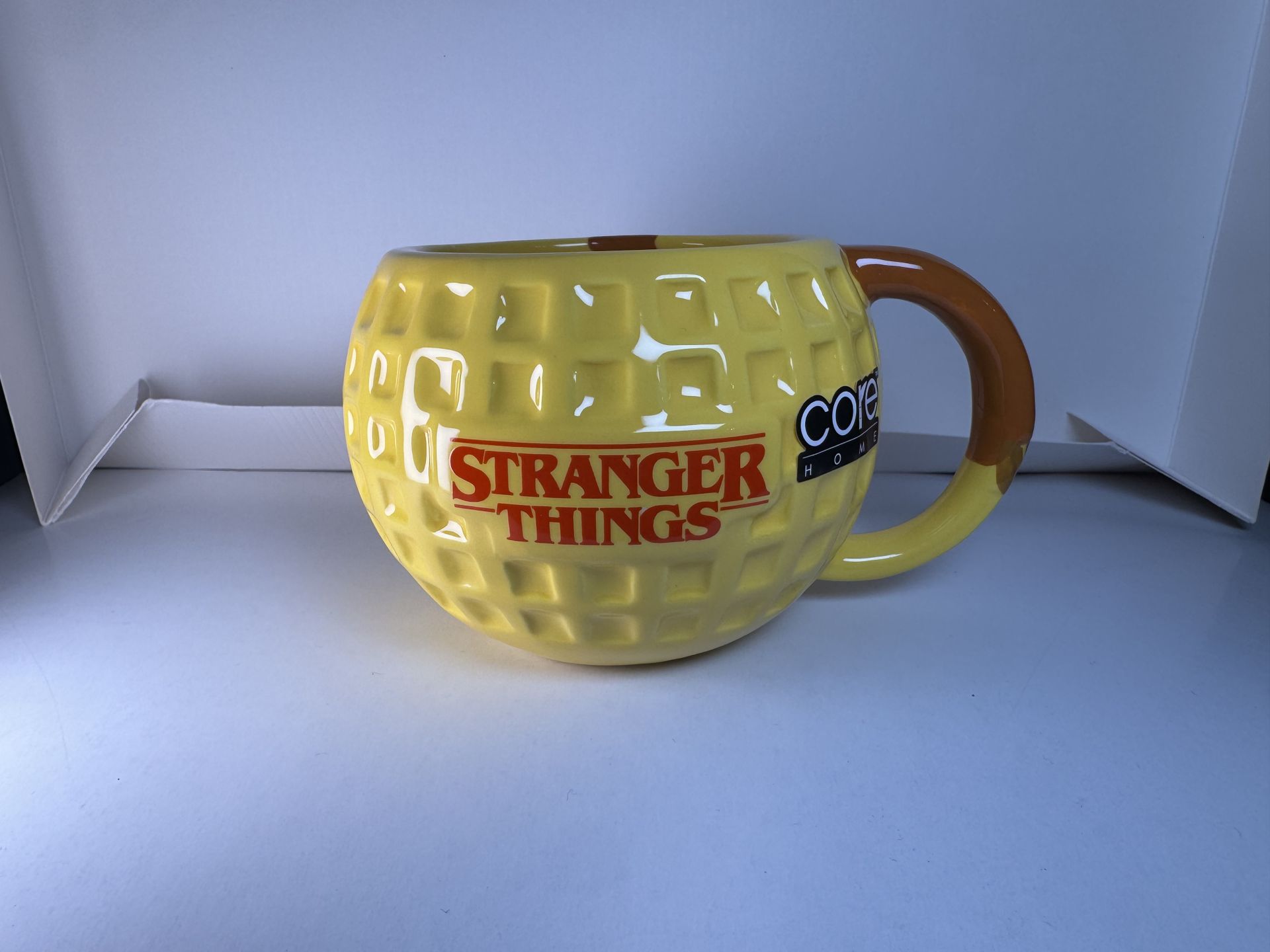 Stranger Things Eggo Waffle Ceramic Mug – Large Novelty Coffee Cup – Brand New Brand new Stranger Things ceramic mug designed to look like Eleven’s iconic Eggo waffle from the hit Netflix series. This oversized novelty mug features a detailed waffle texture with “melting butter” accent on the handle and rim, plus official Stranger Things branding. A must-have collectible for fans of the show. Perfect for: • Coffee, tea, hot chocolate • Display piece for collectors • Stranger Things fans • Unique gift idea Details: • Officially licensed Netflix merchandise • Microwave safe • Dishwasher safe • Durable ceramic construction • Large capacity novelty style mug Condition: Brand new. Never used. No chips, cracks, or damage. Please review all photos carefully before purchasing.