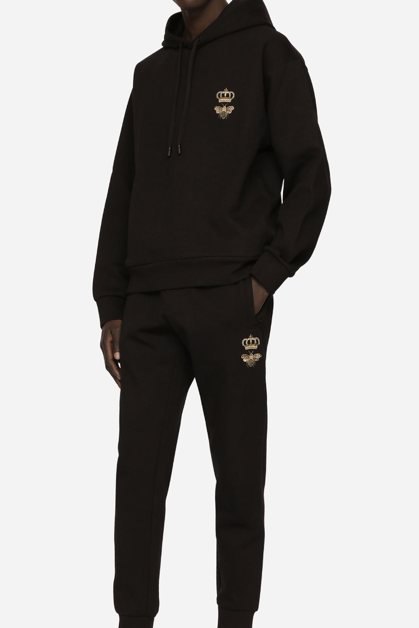 Art. Nr. G9VC8ZHU7H9N0000 The “Essential” Collection is the modern men's closet designed by Dolce&Gabbana. A range of timeless, iconic pieces developed across all product categories. Technical jersey hoodie with lurex embroidery. • Regular fit • Drawstring hood with branded metal aglets • Stretch knit hem and cuffs • The piece measures 69 cm from the rear collar seam on a size IT 48 • The model is 185 cm tall and wears a size IT 48 • Made in Italy External composition: 71% Cotton 29% Polyester Retails for Hoodie $945 Art. Nr. L4JPDEG7A5XN0000 Dolce&Gabbana is giving shape to a timeless wardrobe, composed of iconic pieces that are perfect for the every day. Innovative materials and exclusive details reaffirm the brand’s distinctive style accents. These fleece joggers feature the iconic bee with crown embroidery. Jersey jogging pants with bee embroidery Retails $265 Ask for the size. The color is black for both Customer is welcome to get clothing verified by a professional with me present.