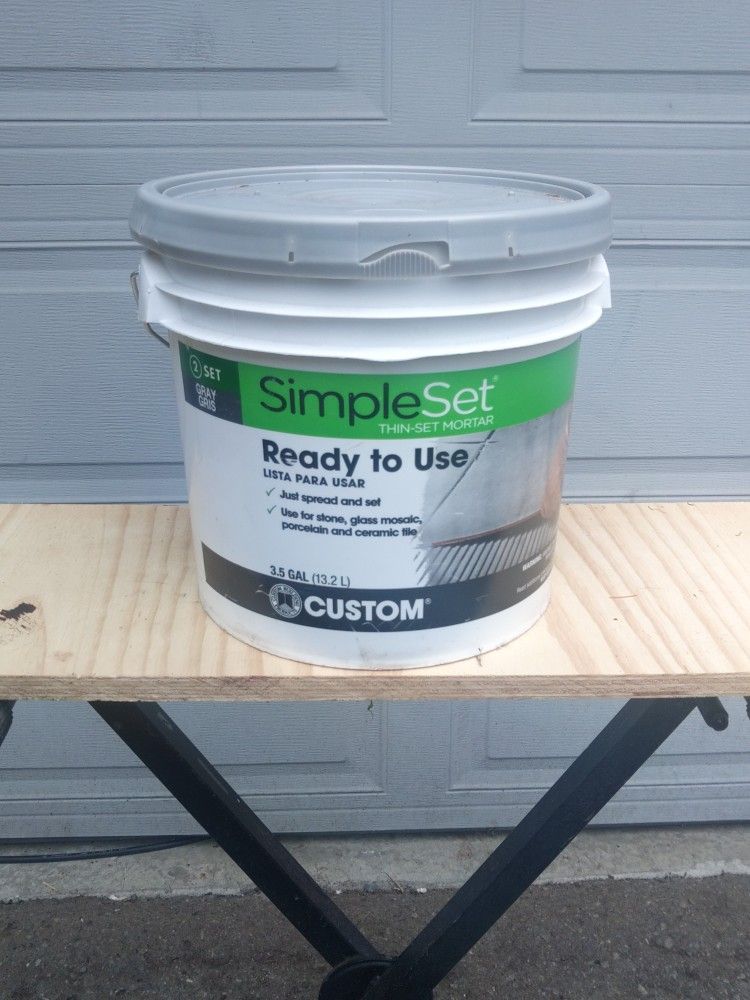 SimpleSet pre-mixed thinset mortar 3.5 gal. Unopened bucket from a tile job that never happened. Paid $60 at Home Depot.
