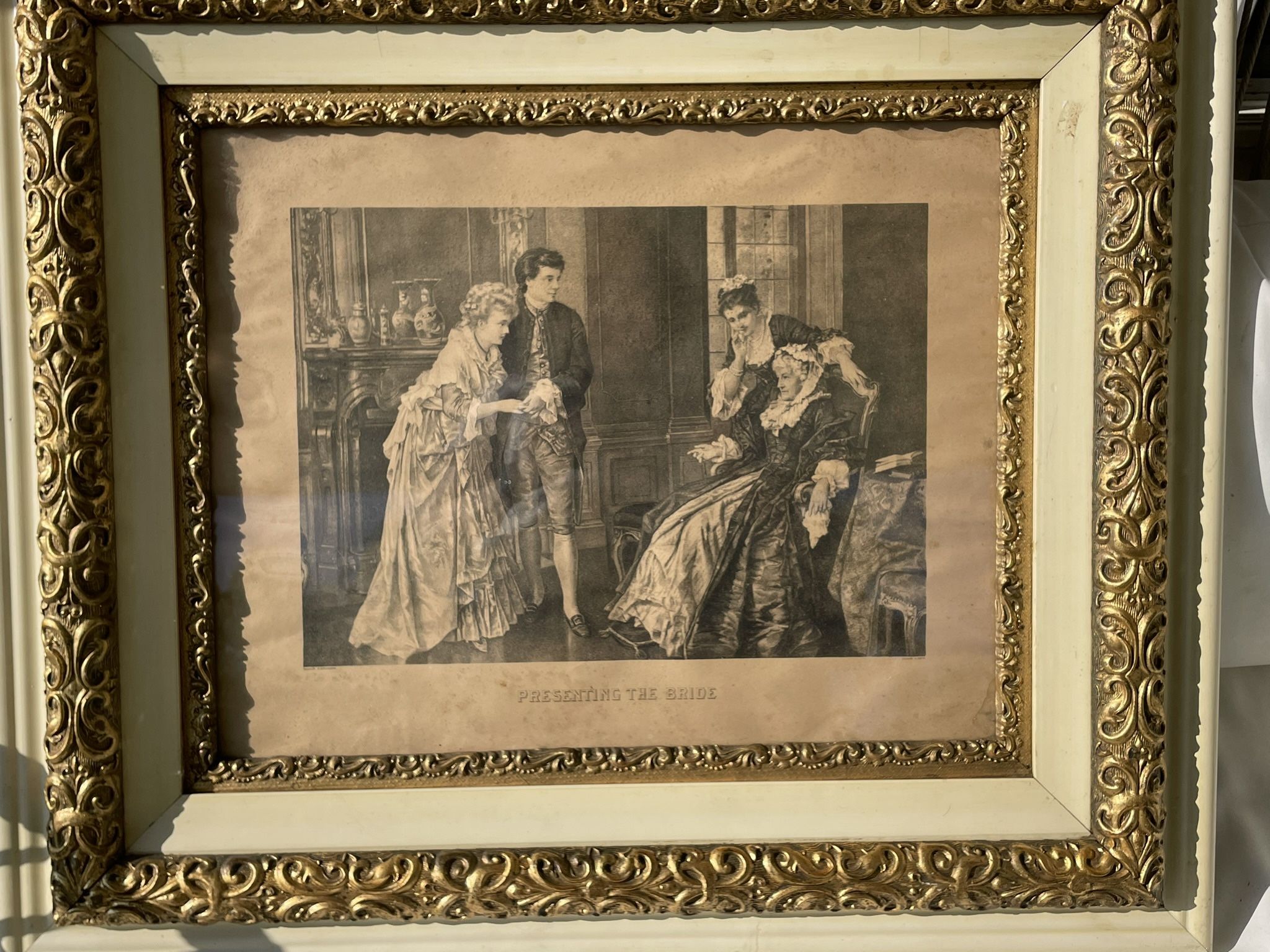 Antique “Presentation of the Bride” original print. Antique in gold gilt frame.