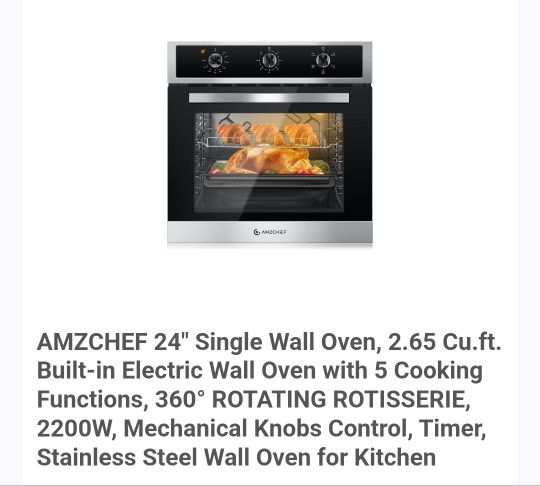 AMZCHEF 24" Single Wall Oven, 2.65 Cu.ft. Built-in Electric Wall Oven with 5 Cooking Functions, 360° ROTATING ROTISSERIE, 2200W, Mechanical Knobs Control, Timer, Stainless Steel Wall Oven for Kitchen