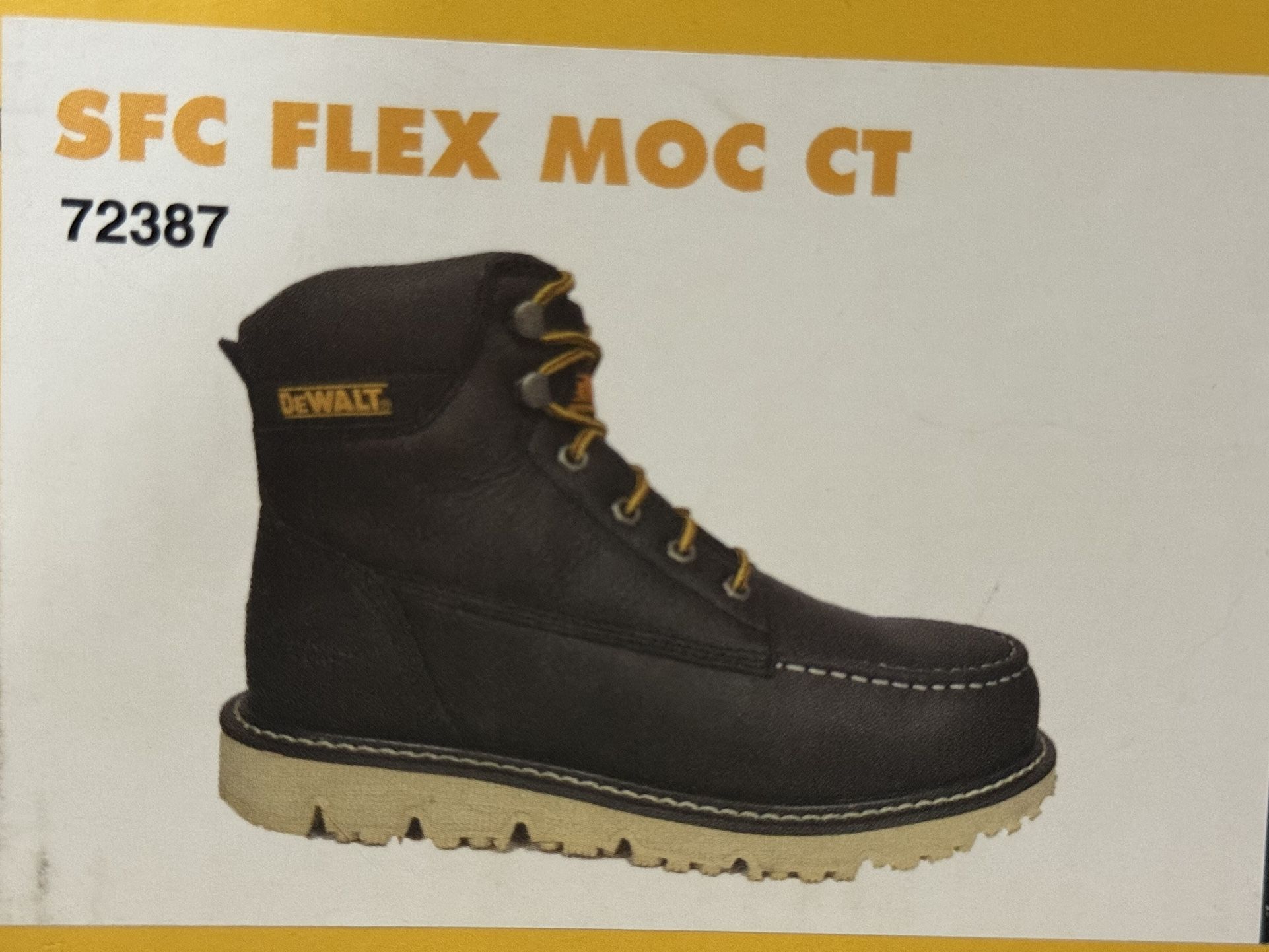 Dewalt work boots, SIZE 11.5 MENS BOOTS , SFC FLEX MOC CT 72387 DEWALT Slip Resistant Infused with our proprietary non-slip outsole designed to prevent slips & falls on slippery, hazardous surfaces. EASY CLEAN Tread Stops debris from sticking to the bottom of your shoe for easy cleaning. Electrical Hazard Rated (EH) Prevents live cables & dry environments from shocking you. Nanotube Carbon Fiber Safety Toe Our lightest safety toe that's stronger than standard composite toes & ideal for both cold & hot workplaces. Non-Metallic (Metal Free) If the metal detector beeps, it's not because of your shoes. Water Resistant Treated to temporarily stop liquids from seeping Inside boots