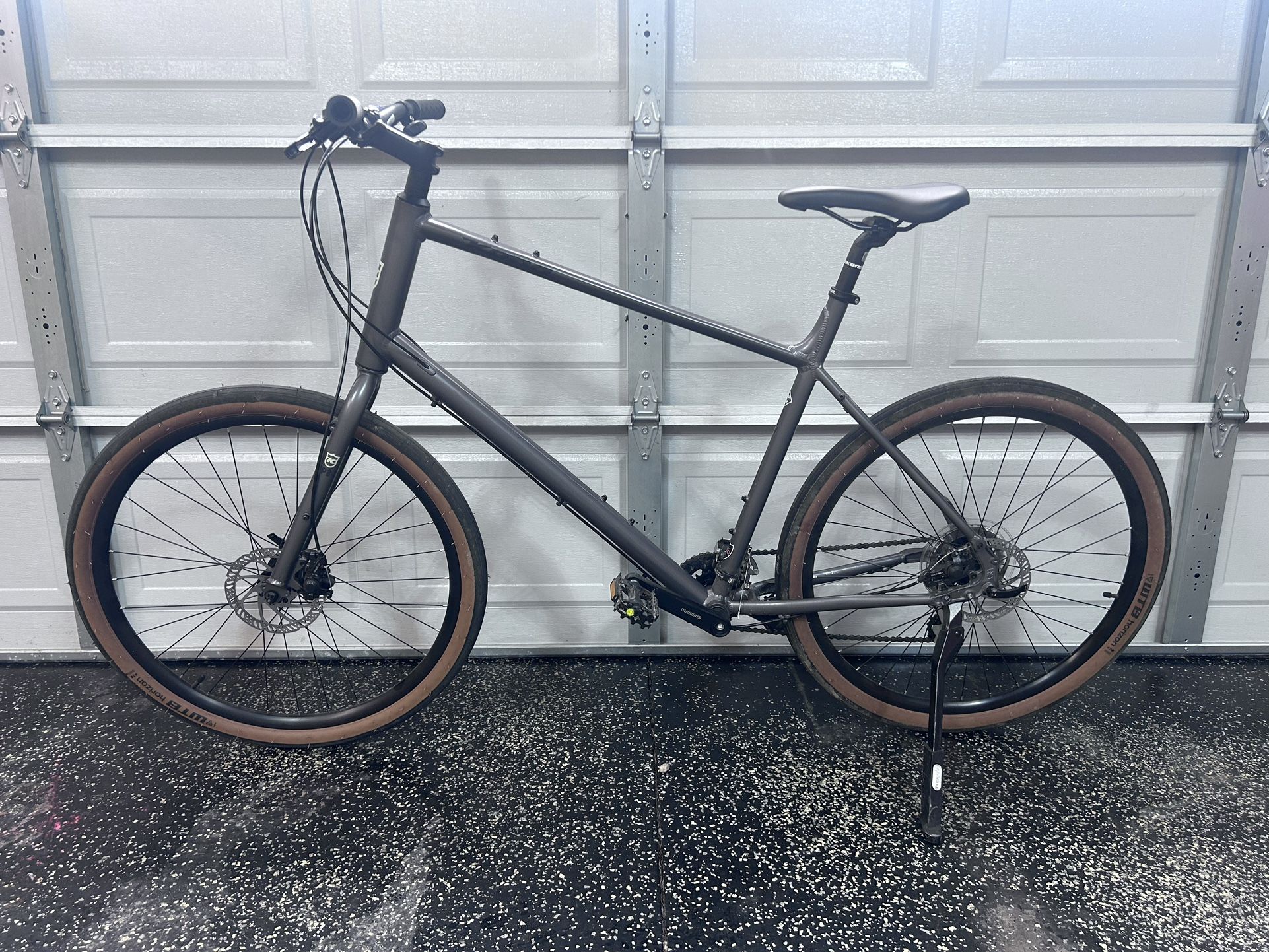 Kona Dew Men’s 16 speed hybrid bike. XL aluminum frame - 23”/58cm seat tube length. Shimano Altus Components. Mechanical disk brakes. Kickstand. Good tread on tires. Light wear with no issues. Reasonable offers considered.