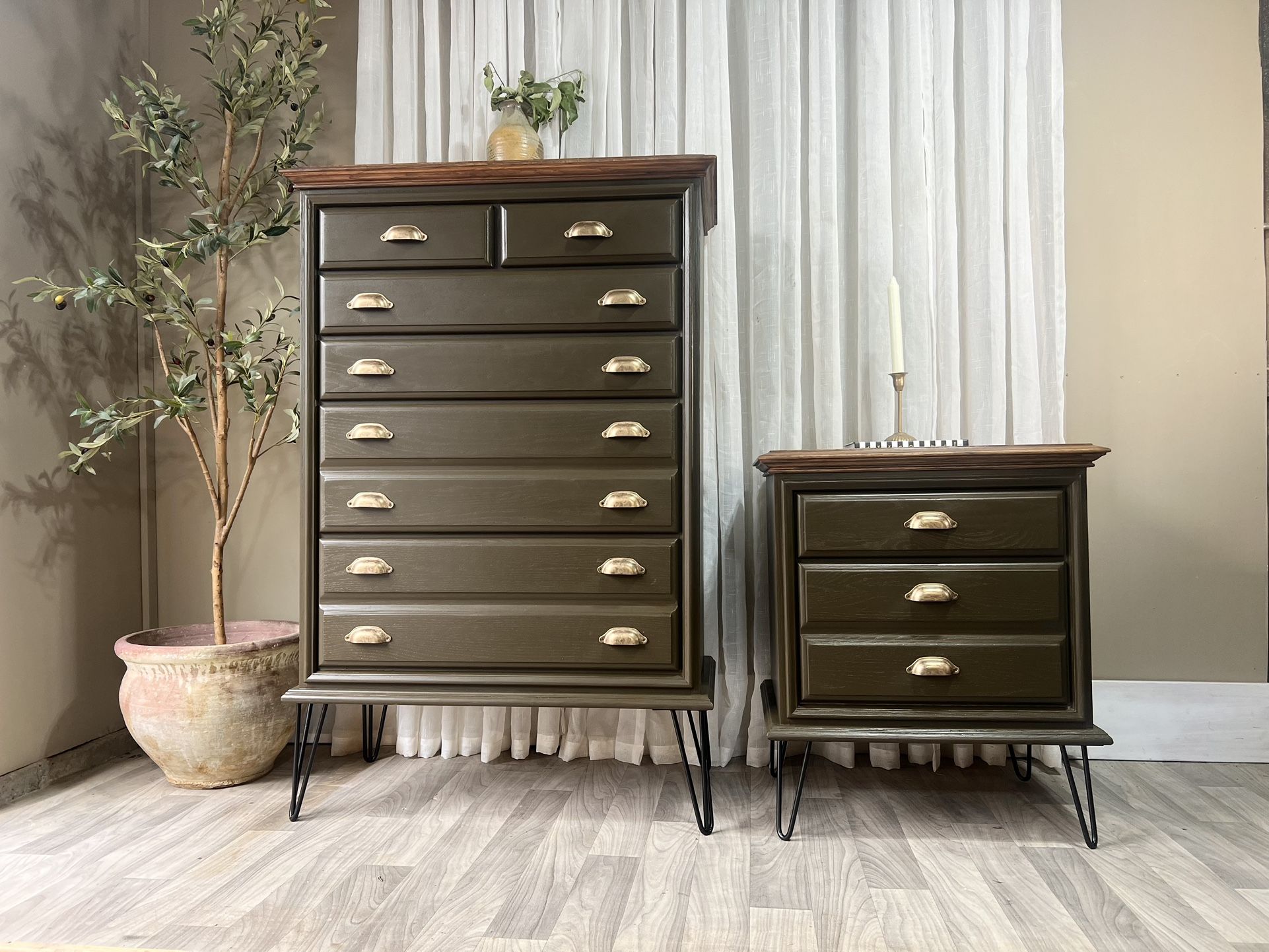 Priced Separately Lowboy- $395 !!SOLD!! Tallboy+nightstand - $395 Amazing solid wood apothecary style dresser set. Large lowboy, a Tallboy or chest of drawers and one nightstand. They have been sanded down to original wood, professionally prepped, painted and triple sealed in a satin lacquer using an airless spray gun for a smooth, flawless and extra durable finish. Tons of drawer space! Drawers are lined with designer wallpaper, feature bronze/ gold cup drawer pulls and they all slide excellent. They sit on 3 rod iron legs. Paint is a gorgeous deep olive color, top is stained in dark walnut. These pieces could be used in a number of places in your home. Could be used as a dresser, credenza, buffet, sideboard, entryway cabinet storage, a tv stand /entertainment console, changing table, in nursery, kitchen, end table, gentlemen’s chest etc. Dimensions: Lowboy 64” L 18”D 37.5” H Tallboy 36” W 19” D 54” H Nightstand 25.5” W 19”D 30” H -About my work- I’ve been perfecting my craft of refinishing high quality, solid wood furniture for 9 years. I pride my work on attention to detail and providing excellent and smooth paint and stain finishes, sealed with polyurethane or lacquer. I use only non toxic, high quality products. If you have a piece you’d like refinished, Please reach out😊 I accept cash or Venmo and require a deposit to hold an item, otherwise first come first serve! All pieces are in great vintage condition and sold as is. Sales are final.