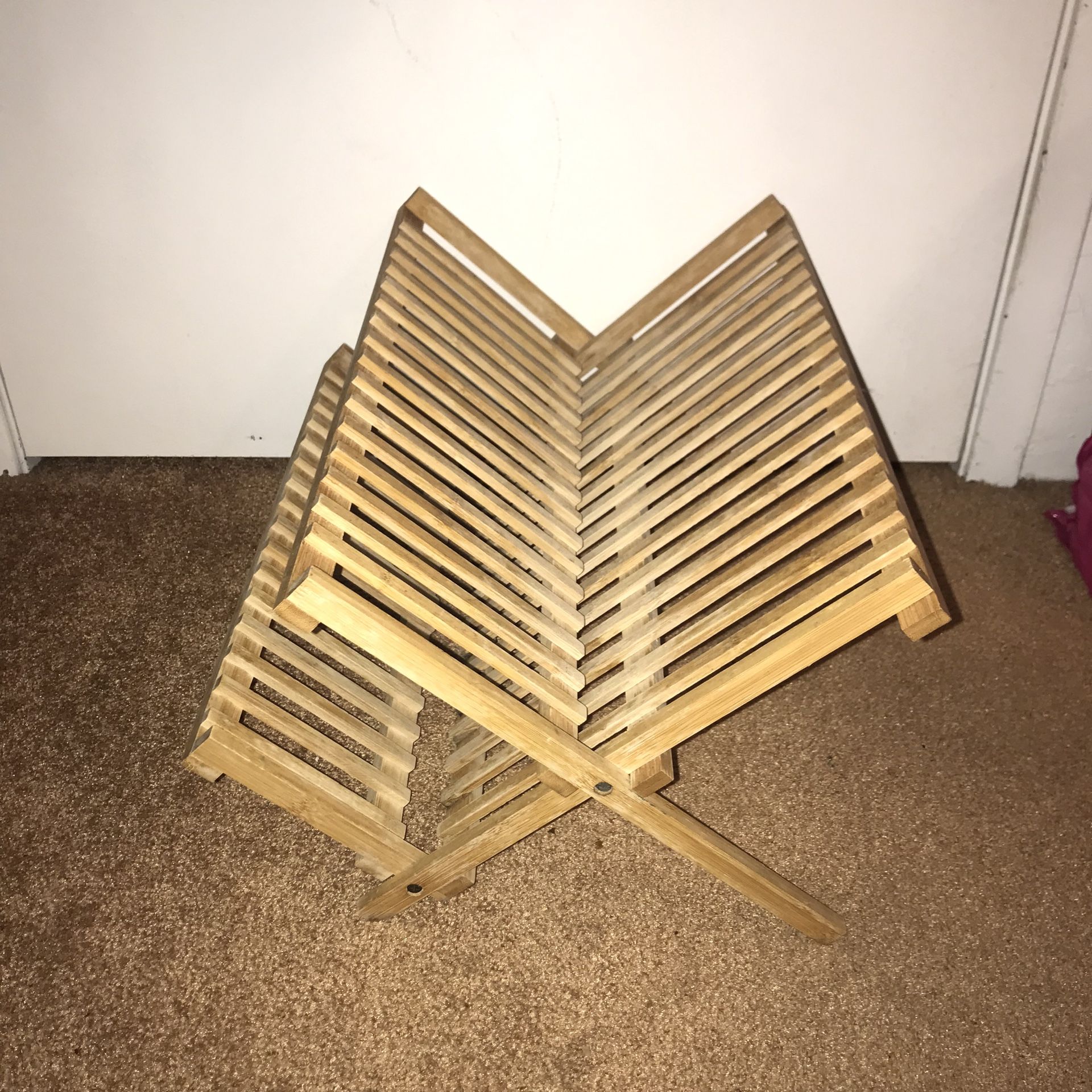 Unique natural bamboo collapsible dish drying rack. Dimensions are 18” by 11”, and 9 1/2” tall. In great condition, small amount of water discoloration shown in the last 2 pictures, This does not affect the solidity of the bamboo and can barely be seen when set up. Message me if your interested