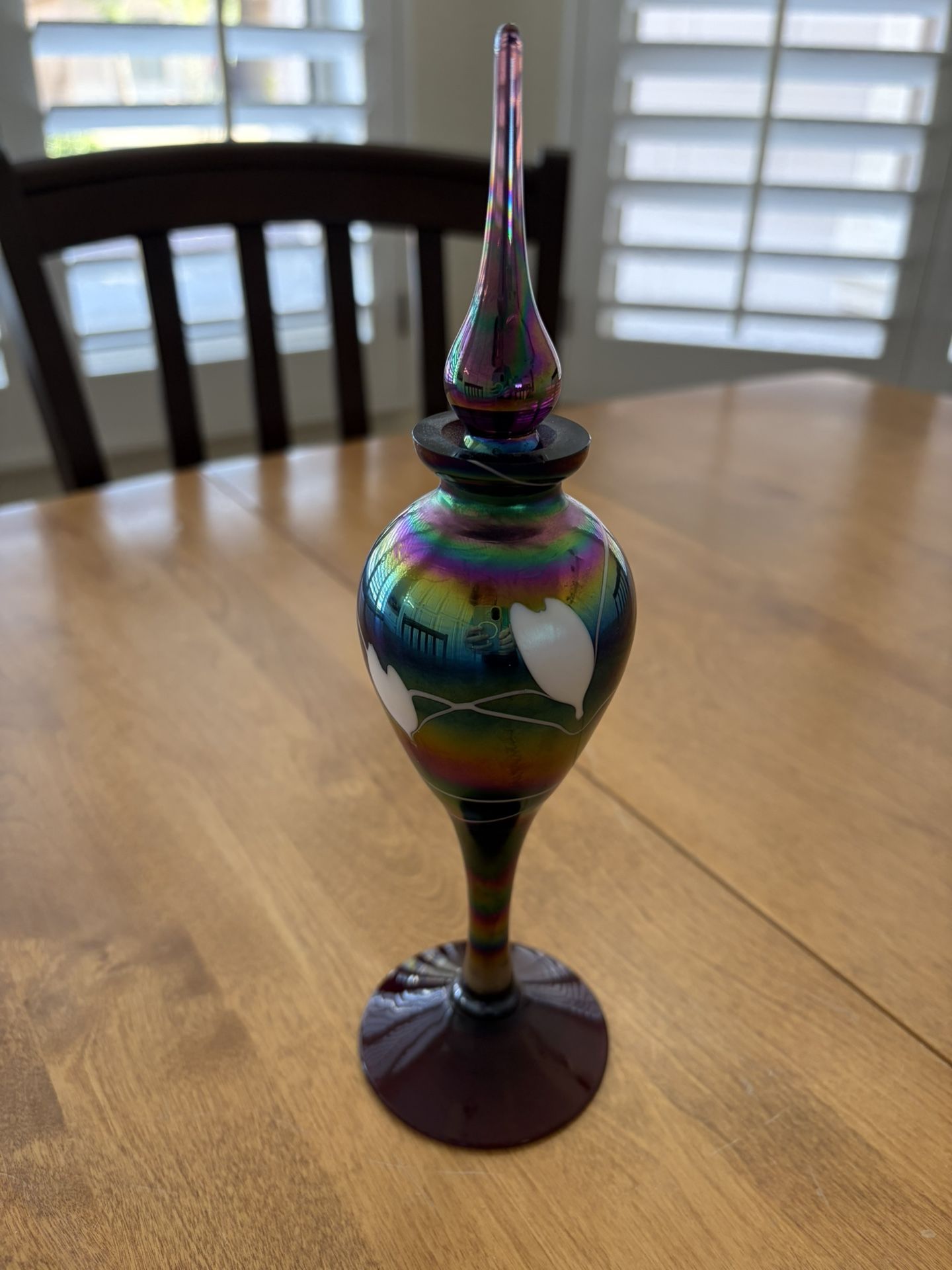 Unique amethyst, iridescent art glass bottle. Has beautiful rainbow colors in hanging hearts pattern. It is 9 inches tall. Great for decor or as a perfume bottle. Queen Creek and Power Rds, Gilbert