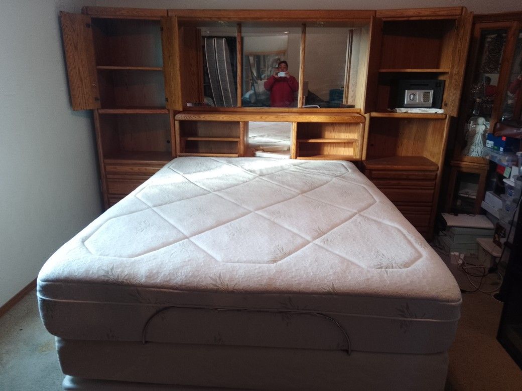I have a set available for sale in like new condition minus a couple water marks on the counter top. I'm selling it for my mom who never sleeps in it, sleeps on couch. We're moving a new person in this room so it's getting sold. The mattress and box spring are like new even though it's about 10 years old. It doesn't smell like anything or anyone and never been smoked around. It's still firm with no denting. Mattress and box spring are like new. It adjusts at the head in 2 positions and 2 positions at foot. I think it vibrates. I tested electronics prior to deinstalling it but I forgot to test the 4 lights that are above the mirrors, should be fine You'll need a truck, but we may have one on Saturday for a short period. Text me for scheduling a time to pick up. OBO... we'll negotiate in order to get it moved quick because we're running out of room to store it, needs to go soon Buy with confidence!