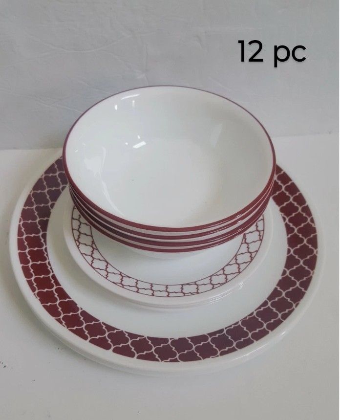 White/red Corelle set 12 pieces Barely used but it is still in very good condition