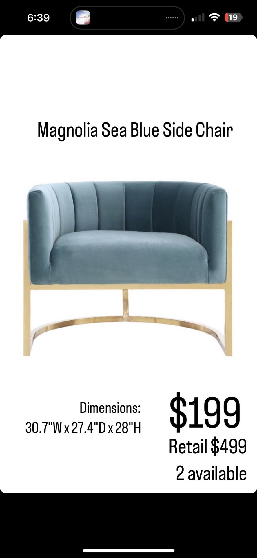 Tov furniture Magnolia sea blue chair 2 available Brand new in box sold as closeout from our warehouse Retail $499