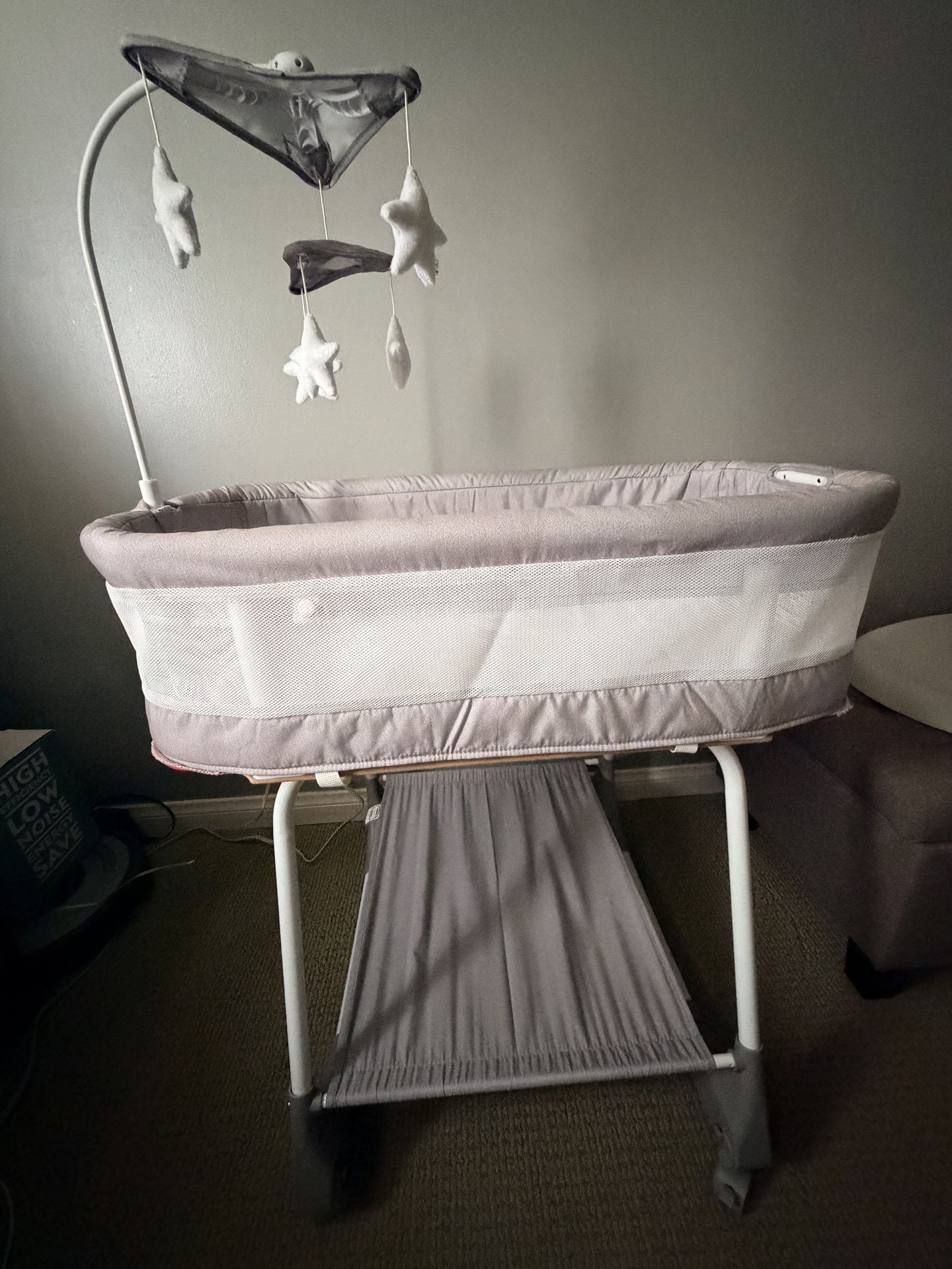 Great condition! Only used for 2 months. We placed this bedside and rolled it into living room during the day, very convenient to have the wheels attached (but you can hide them too if you don’t anticipate rolling it from room to room). Missing music machine but baby didn’t care for it one way or another. Retails $115, selling for $45 cash only. Help your baby (and yourself!) get some much-needed sleep with the Shooting Star Rocking Bassinet with Air Flow Mesh by Simmons Kids. Adding to the calming oasis, this portable crib gently rocks with a light push from you while the stationary, two tier toy arm adorned with plush stars will help soothe your baby. Breathable mesh sides all-around allow for visibility and airflow, and the comfortable mattress pad provides a cozy environment that promotes good sleeping habits. Designed with ultimate convenience in mind, the bassinet’s wheels make it easy to move this portable crib from room to room and a large storage shelf keeps diapers and nighttime necessities close by. The smart design of this baby bassinet is versatile enough for your baby’s first months at home. This bassinet is recommended for babies 0-5 months. Max weight 30 lbs. Stop use at 5 months or once your infant begins to push up on their hands and knees, whichever comes first.