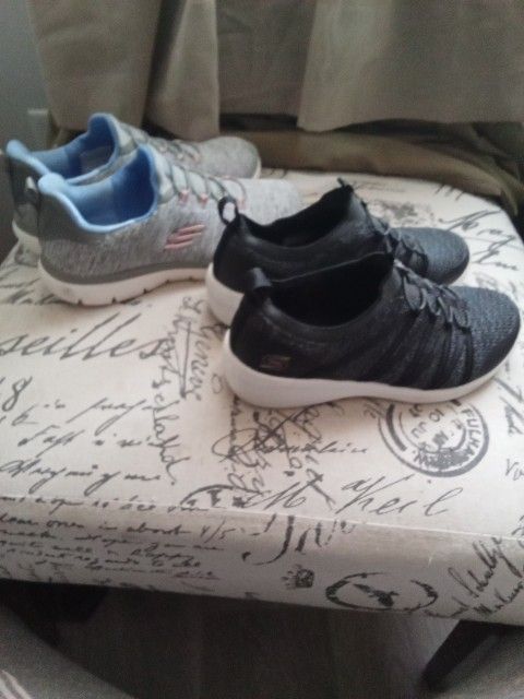 Women's size 6 memory foam Skechers,worn once the black ones, also a pair of grey and blue women's sketchers both for one price