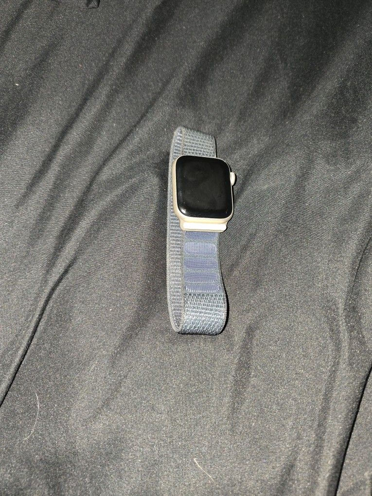 Starlight Apple Watch SE 2nd Gen. Bluetooth model, has blue stretch sport band. $100! Willing to trade for samsung watch. Nothing older than galaxy Watch 3. SERIOUS BUYERS ONLY!!!