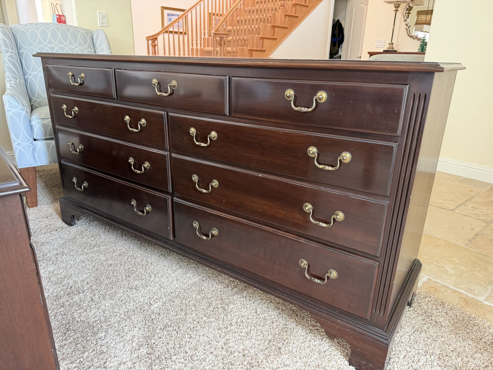 Georgian Court collection with a beautiful cherry finish. One nightstand needs some refinishing on the top but otherwise in good condition. Includes dresser, two nightstands, and a mirror as well. I have a matching armoire for sale, check my other listings for details.