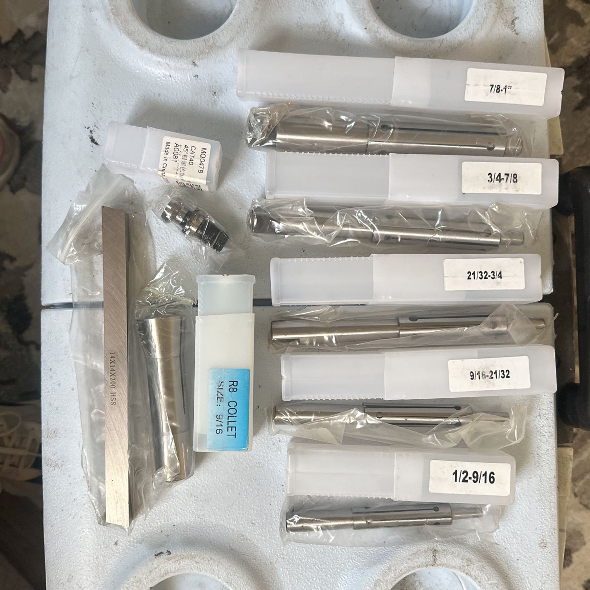 All new never used bundle of 8 pieces total asking fair price of $99 for all - 5 piece expanding mandrels & sleeves set 1/2”-1” - one piece stock HSS 14mmx14mmx200mm - one collet R8 9/16” - MQ0478 CAT40 45 degrees A0081