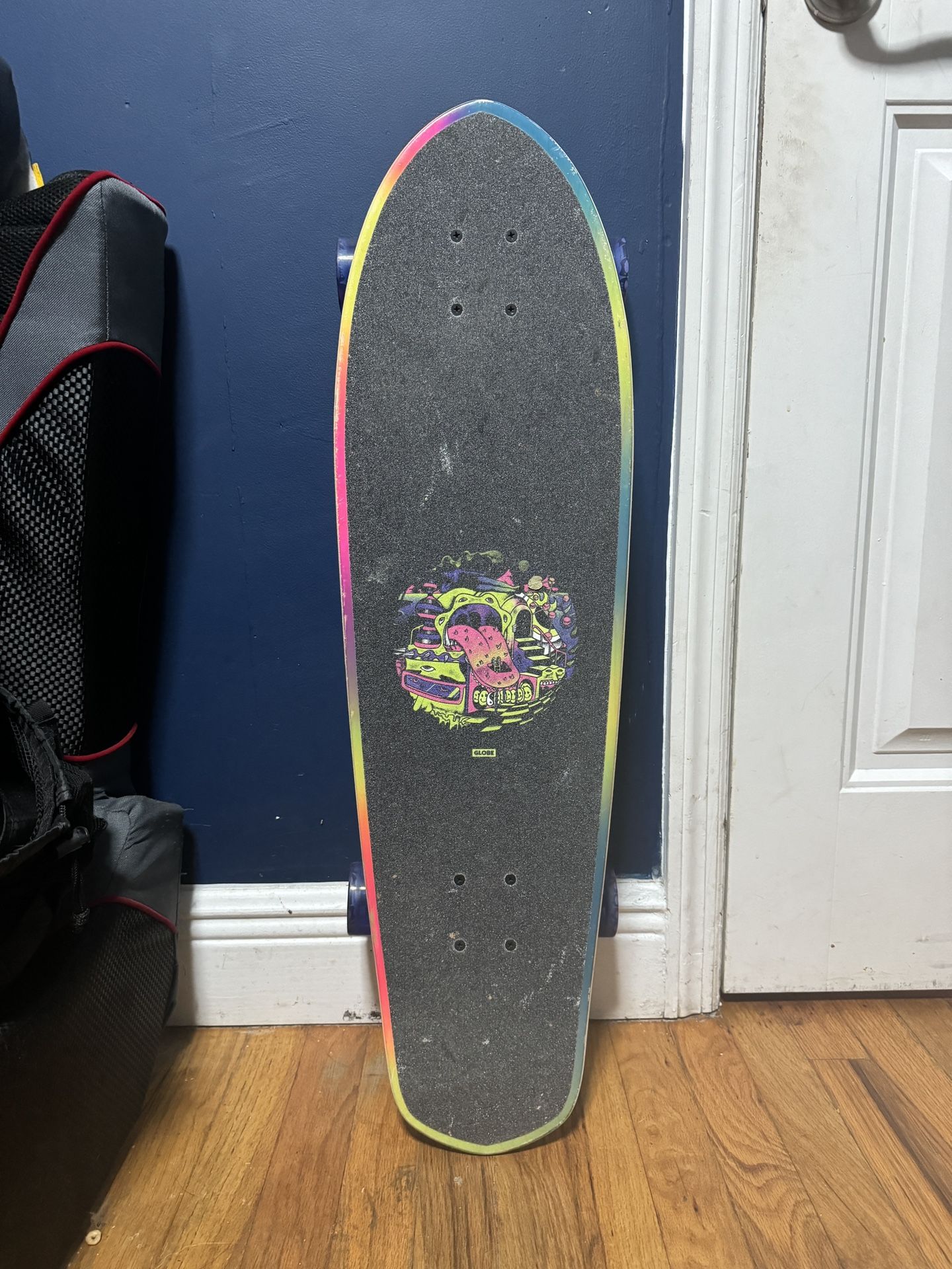 Trippy skateboard design with rubber wheels