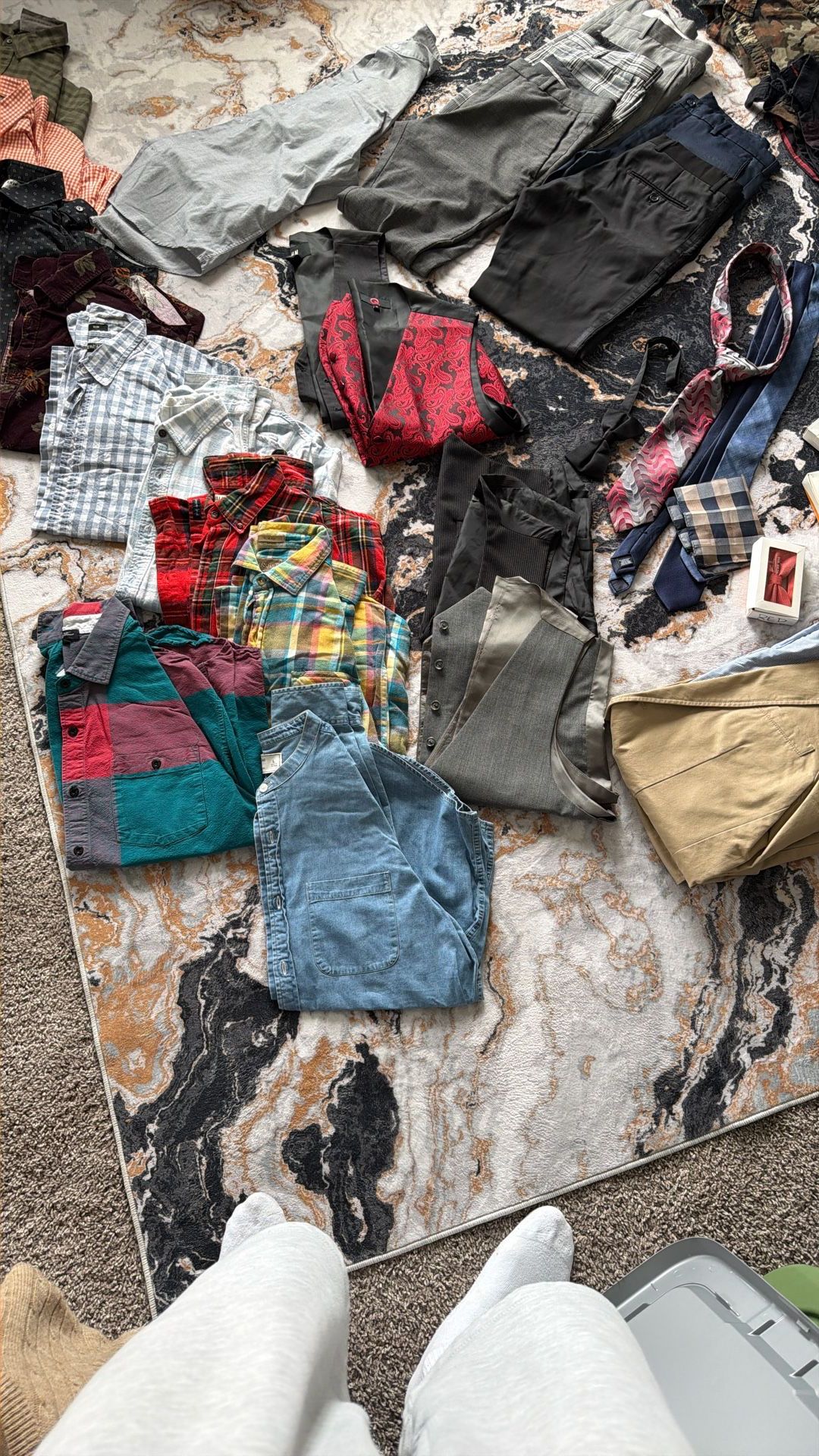Men’s clothes button ups 30-40+ pieces total. These clothes have been taking up space and I am ready to sell them all at once. So this will be a BUNDLE price for everything and they will come in two storage containers.. I’m asking $200 EVERYTHING IS IN GOOD WEARABLE CONDITION. The sizes of the clothes are primarily medium and large button ups 32-33 waist dress pants Men’s ties are adjustable You will get what you pay for! Some of the brands include Michael Kors, banana republic, H&M & MORE Must buy all at once $200 takes everything. Pickup Only in 779064