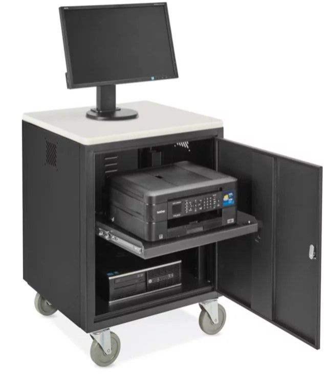 Only $119.98- (60% off!) List Price $299.95 See Images for more Details: Slightly Used , Perfect Condition Harness the strength, security, and mobility your AV gear demands with the Uline Mobile AV Cabinet H-7549. Built with robust powder-coated steel and topped with an elegant laminate wood surface, this cabinet combines durability with professional appearance. The locking front door ensures projectors, printers, or AV equipment stay secure between uses. Inside, a slide-out shelf (adjustable in 2-inch increments) accommodates equipment of varying sizes, while cable management is built in with grommets and a ventilated rear door to prevent overheating. The cabinet stands on 5" swivel rubber casters (two locking) for smooth transport and stable positioning. Key specs: Overall dimensions: 23 × 25 × 35 in (L × W × H) Inside cabinet space: ~21 × 24.5 × 25.5 in Door opening: ~21 × 23.5 in (W × H) Load capacity: 400 lbs total, slide-out shelf supports ~40 lbs Cabinet weight: ~80 lbs unassembled; ships unassembled via motor freight This cabinet is ideal for schools, offices, churches, studios, or anywhere AV hardware needs to be stored securely and moved easily. Assembly is required using simple tools; the unit arrives with all parts included. Secure your AV setup without compromising on durability or mobility.