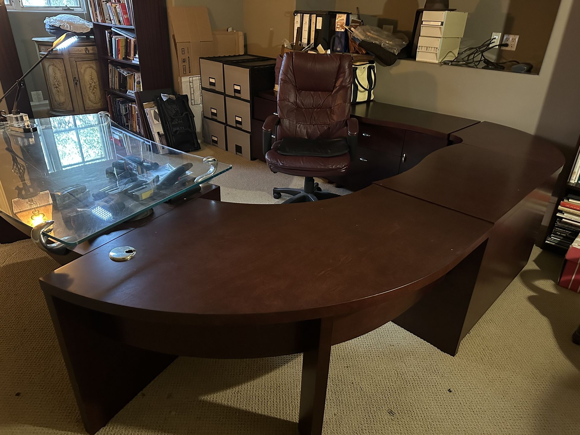 Modern contemporary solid wood curved desk with storage- , sideboards, filing drawers , work station . Desk chair Gently used. Originally Purchased from Rob and Stucky For $12,000.00 Gorgeous Solid wood with glass top 5 pieces Curved desk 1 latereral filing cabinet 2 storage cabinets with drawers and doors 1 corner piece 1 side board with glass accent top As shown - 83 x 100x75” These pieces can be separated and configured differently