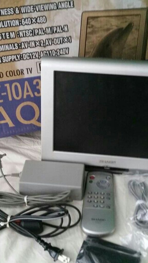 Sharp 10" LCD Color Tv, model LC-10A3U-S, works good as seen in picture as its hooked up to cable, sound is also working good. Comes with box, remote, (batteries not included), wall bracket, power cord, another cord I think its for dvd player. Used