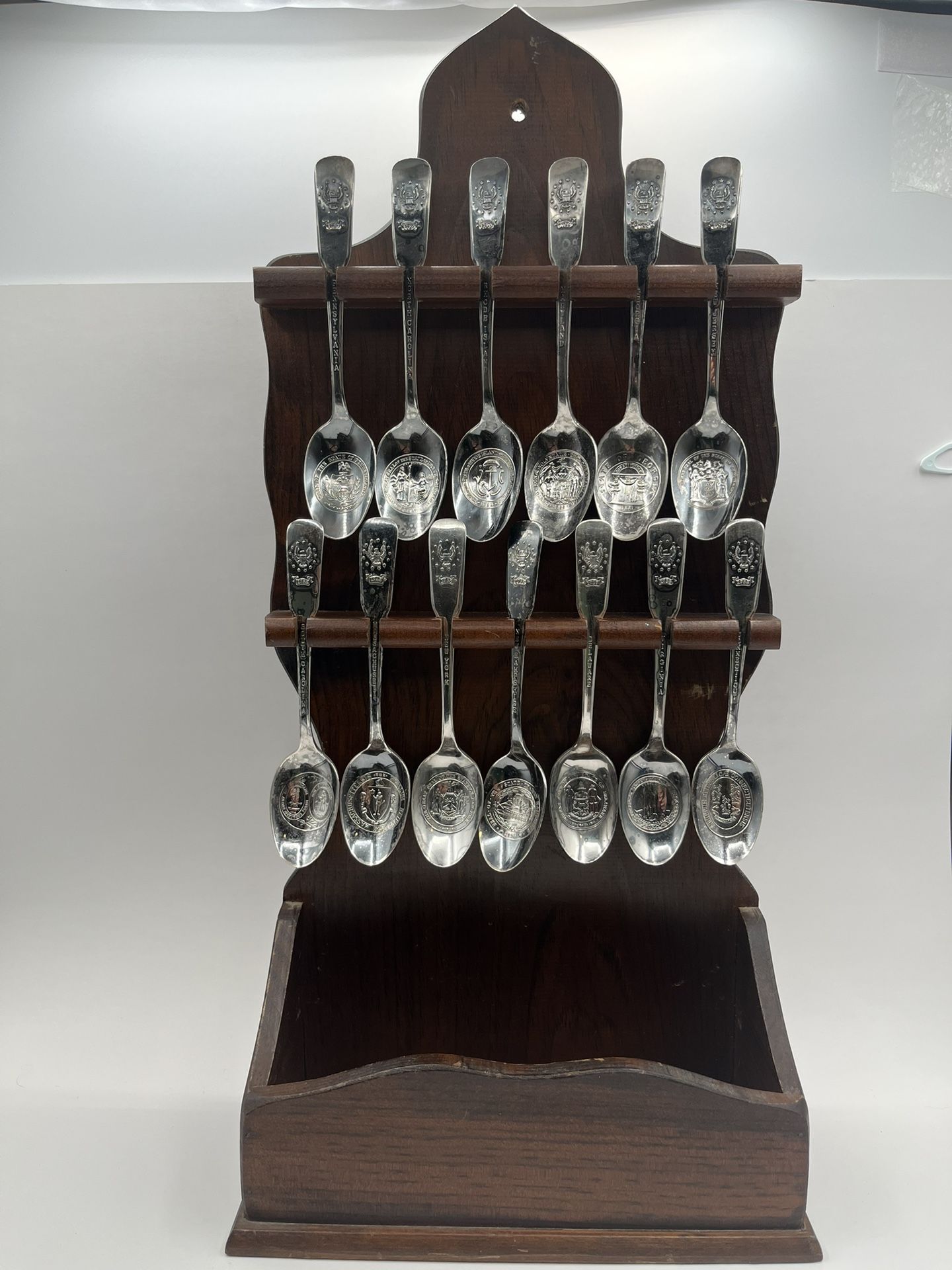 Vintage INTERNATIONAL BICENTENNIAL 1(contact info removed). 13 State Spoons With Wooden Stand. Heigh (spoon) 6”