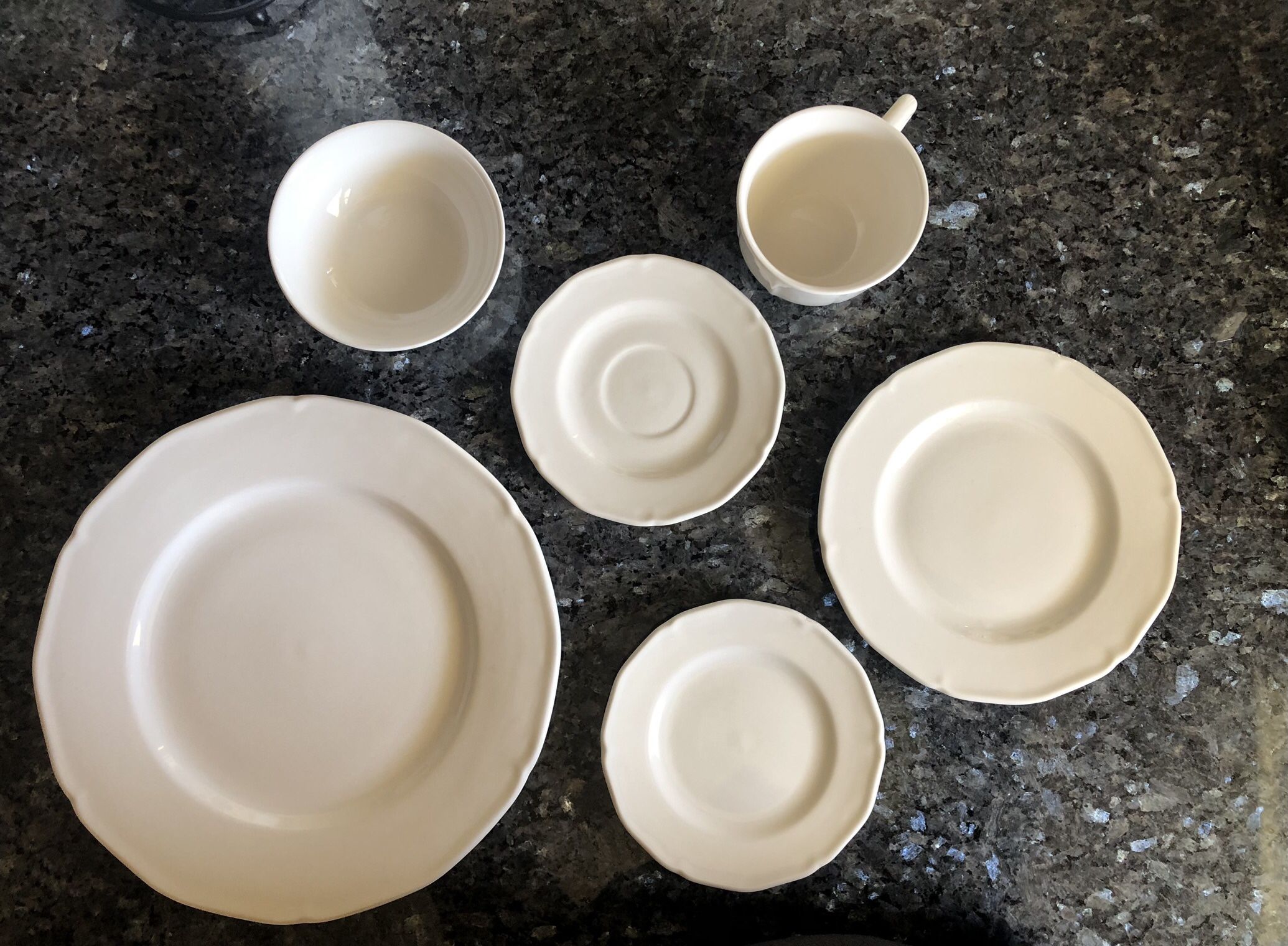 Each full set comes with 7 pieces. (7th piece the larger cereal bowl is in second pic not in cover photo). All has had Normal use. Boxed up and cleaned. Color is a beige off white. Also have various additional assortment of extra pieces. Must take all pieces please. Total count is as follows: Large plates x12 Medium plates x12 Small plate x12 Tea cups x15 Saucer x10 Small dessert bowls x9 Cereal bowls x8