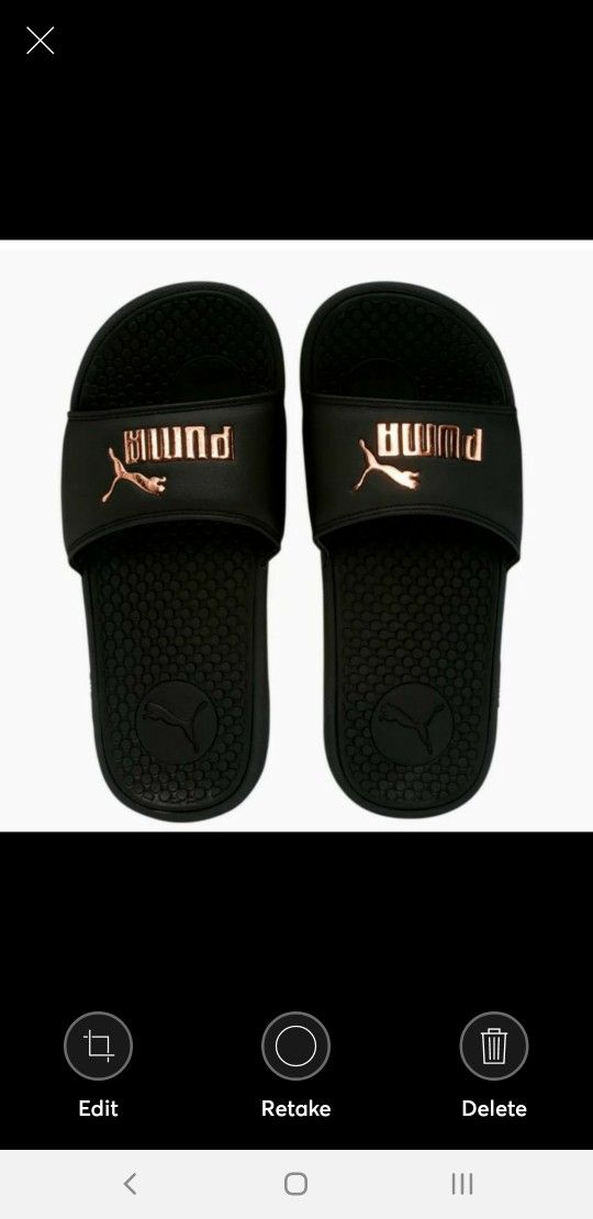 Puma black sandals upper rose gold logo .Slide on and go. Classic lightweight sandals with comfort foot bed and snug strap.