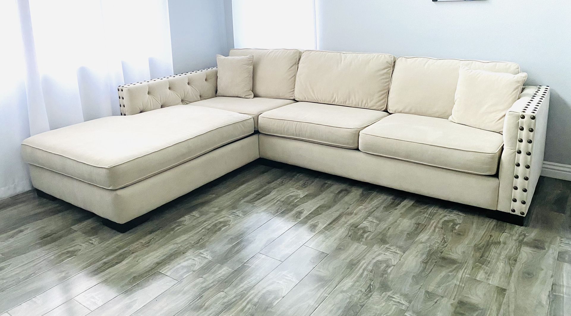 Beautiful large Sofa Couch sectional Chaise L shape, Velvet material Color: Beige This is a very comfortable, fluffy couch Brown studs, brown wooden legs, side tufted. Includes 2 throw pillows Pre-owned in good condition Measurements 89” inches chaise 120” inches wide Small right arm 36” inches Original price $2,500 Pick up only Cash only Location: Trabuco Canyon 92679 For more items visit my page
