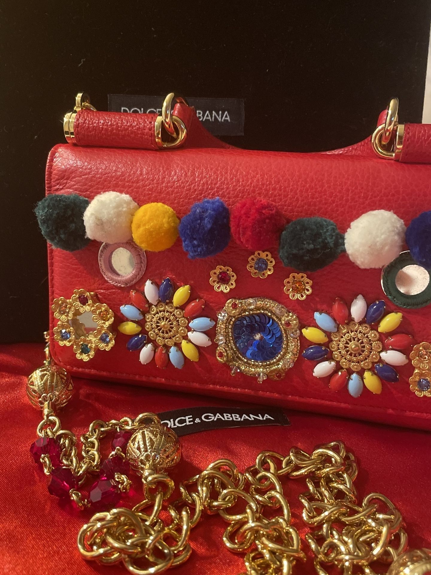 Never been used! Authentic rare D&G limited Sicily phone bag. This is a mini bag with a jeweled gold straps. It’s like a wallet on a chain