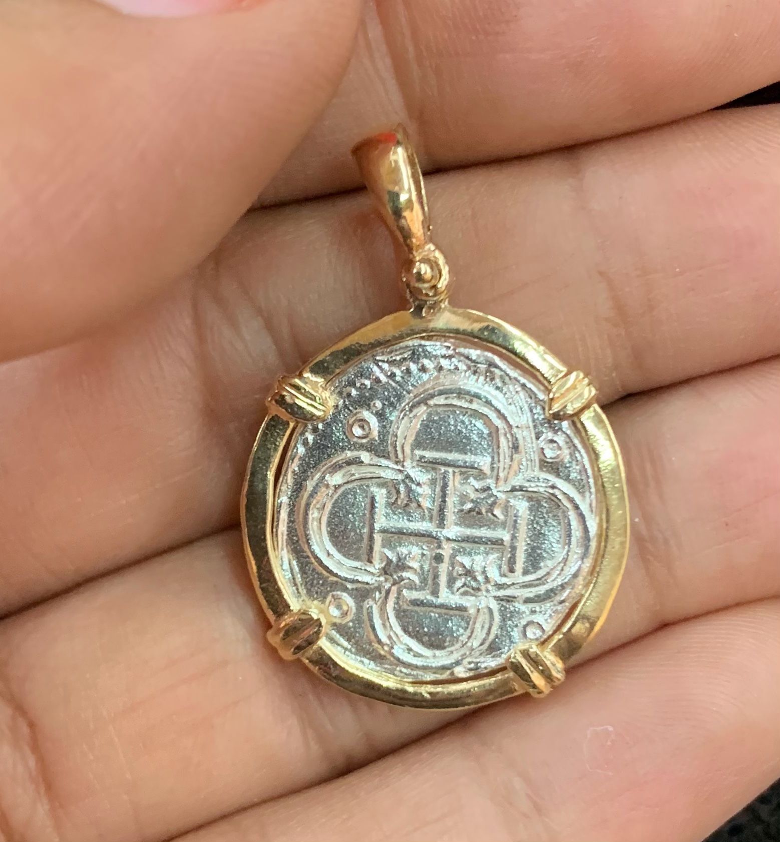 Atocha Shipwreck treasure Mel Fisher silver coin pendant in 14k gold bezel