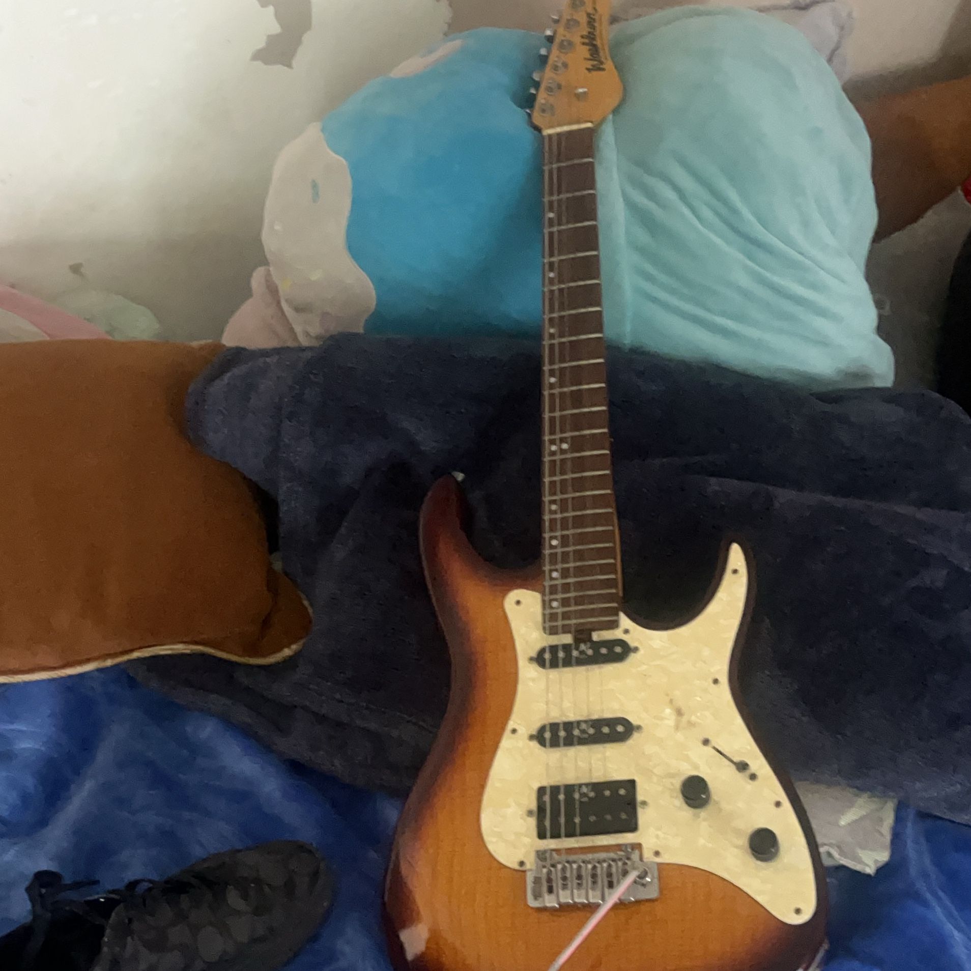 Electric guitar with sunburst finish, cream pickguard, rosewood fretboard, and 3 pickups. Chrome hardware and standard bridge system. Missing 1 string.