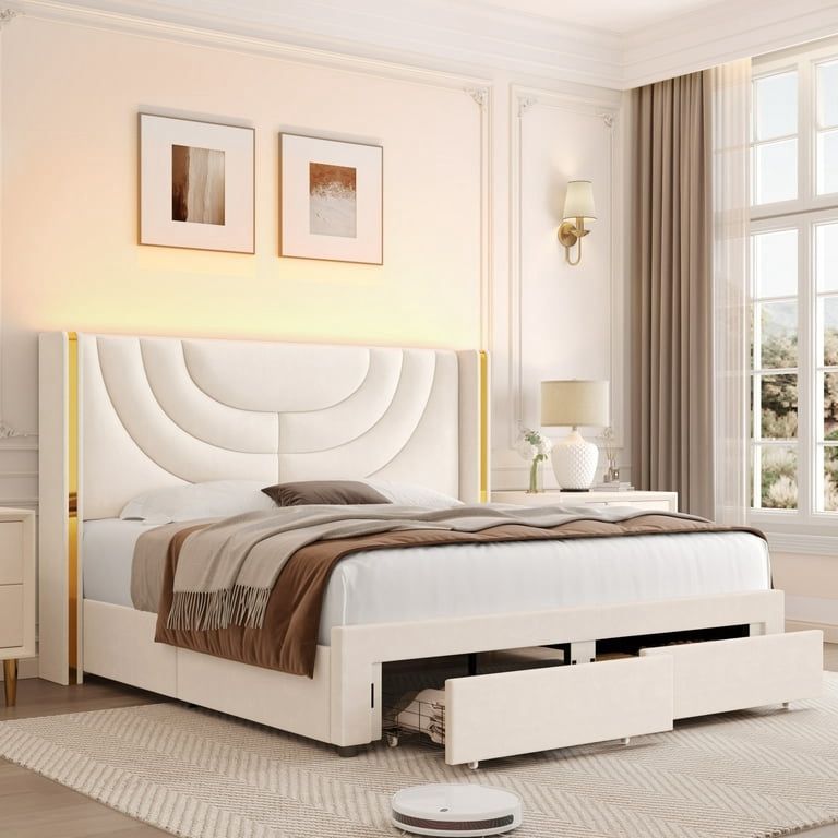Full Size LED Bed Frame with 2 Drawer Storage, Wingback Platform Bed with Velvet Upholstered Headboard, Off-White