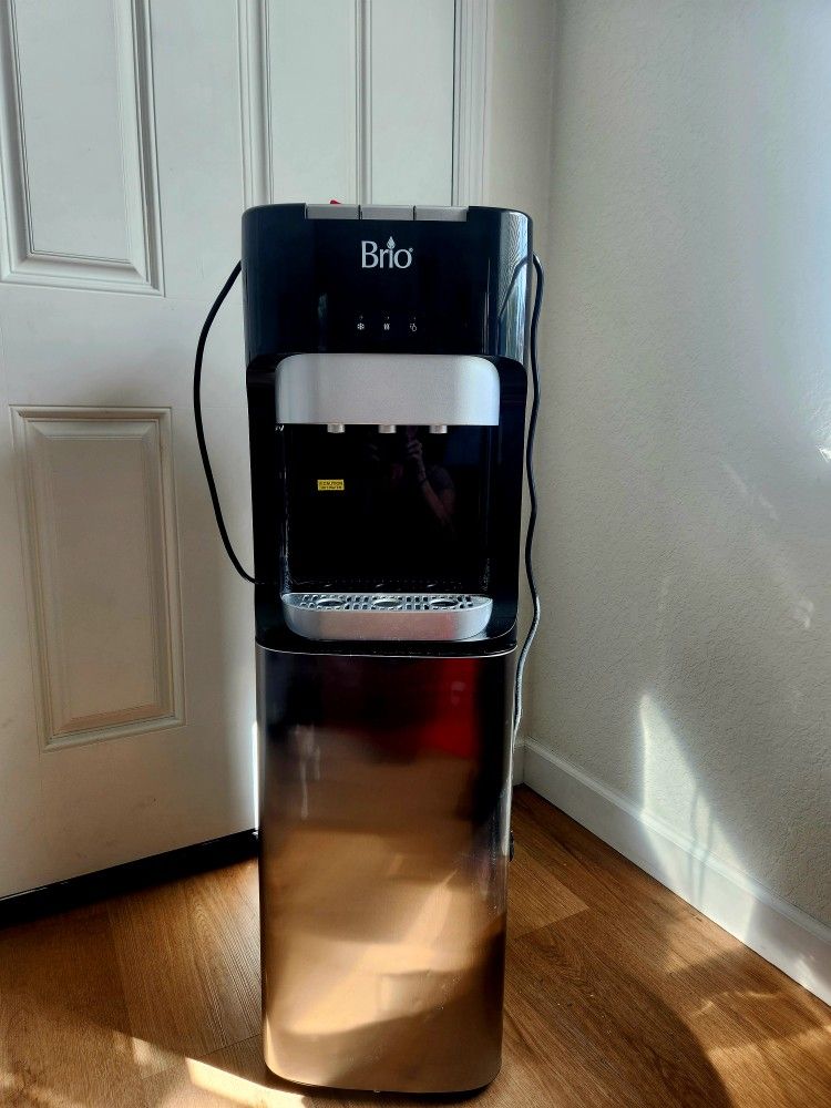 Gently used and in great condition* -BOTTOM LOAD WATER COOLER DISPENSER: Water cooler dispenser for 5 gallon bottles. The cabinet fits either a 3- or 5-gallon jug bottle. -HOT, COLD & ROOM-TEMPERATURE WATER: Three temperature settings allow you to customize your drinking experience. The Brio Essential hot and cold water dispenser features hot, cold, and room-temperature functions.