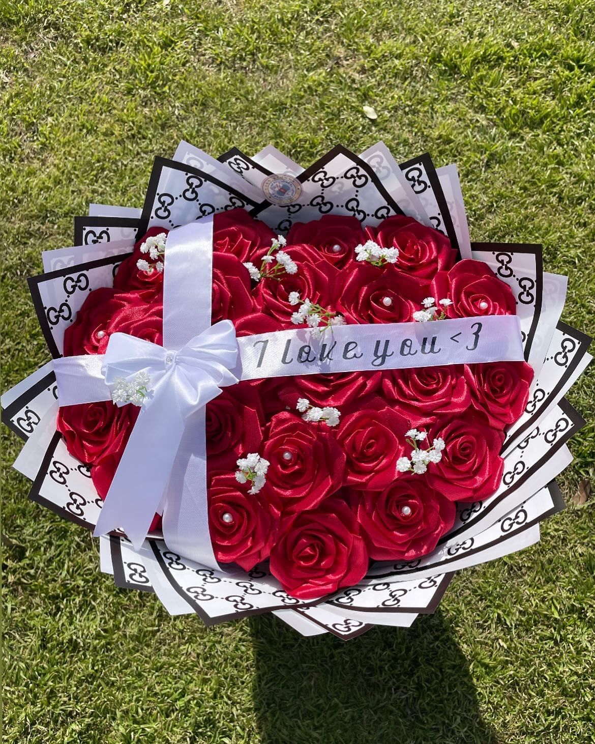 24 Ct Heart Shaped Ramo With Baby Breaths And Message In Gucci Wrapping Paper