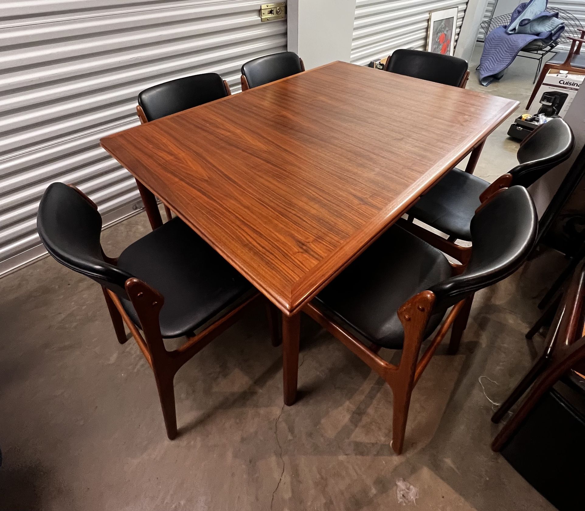 Midcentury Modern Gorgeous Teak Draw Leaf Extension Dining Table from Denmark made in the 1970s. In excellent original condition. Beautiful Teak Graning. Measures 42” w X 60” l X 28.5” h with two 22” leaves. Seats 10-12 and it measures 104” long fully extended. 6 Erik Buck teak chairs (shown in the photos) in black available to pair with this exquisite table for an additional cost.