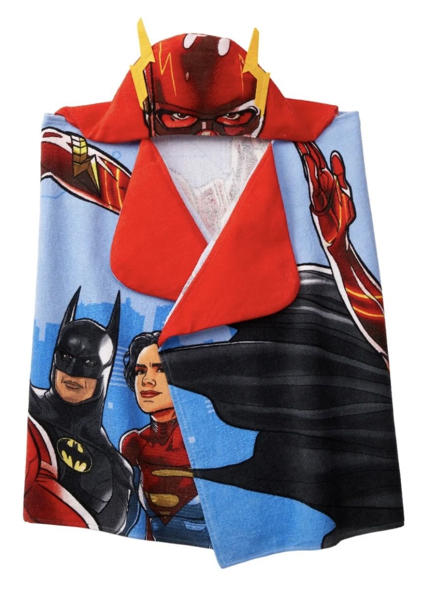 This is a DC-branded hooded bath towel featuring The Flash, a popular comic book hero. The towel measures 24" x 50" and is made of 100% cotton material in a vibrant red color. Perfect for kids and teens, this towel is ideal for use in the bathroom and features a hood for added comfort and warmth. The item is new with tags and comes in its original packaging.