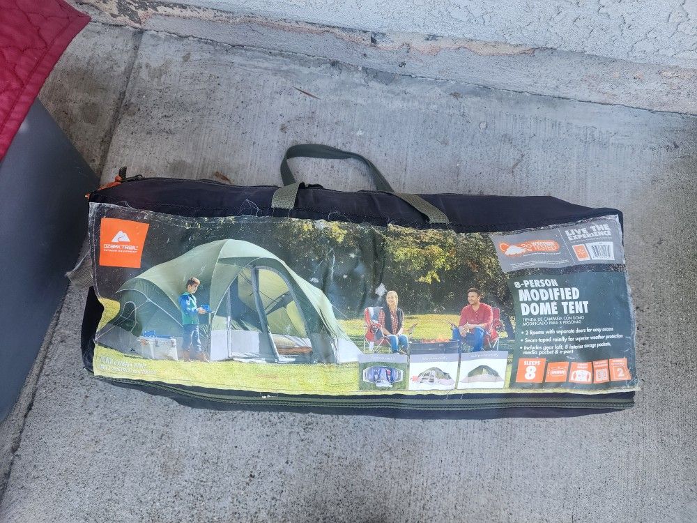 Very clean lightly used 8 person tent, comes with a sheet you put in the middle to make 2 rooms out of it. It's nice and big. I also have a teepee tent, pretty cool. Air mattress and car plug in pump, again very clean and lightly used. I got some battery operated lanterns with LED bulbs, very bright and useful. I have 2 large sleeping bags that can be used down to 0 degrees A little propane grill but the grates are pretty rusty still works good tho if you clean them or get new grates. I haven't touched any of this stuff in over 5 years I don't need it. Camping hasn't been our thing anymore. I'll take best offers on prices for each or take everything for like $150