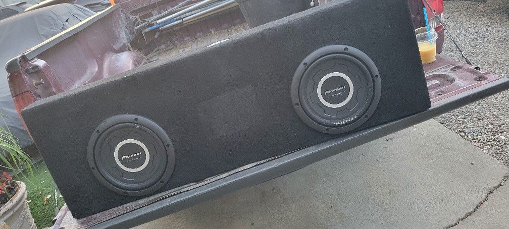10in pioneer old school IB flats 300w Rms each. Ground Shaker sealed box. Sounds great. No tears , you can test before buying if u have speakers already in your car/truck. Had them on a single cab back seat C10.