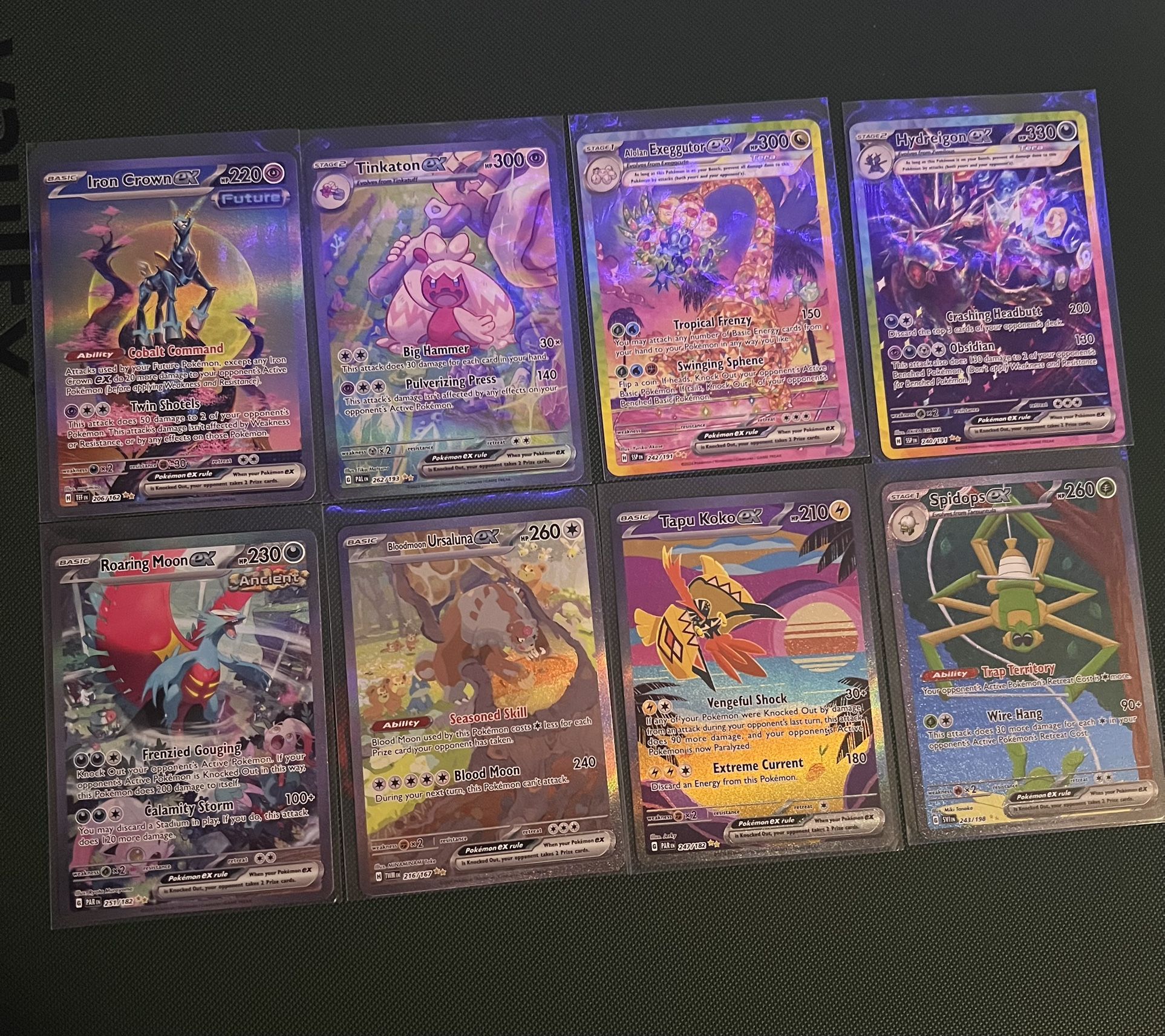 All are pack fresh NM Tinkaton - $30 (I have the Tinkatink too iyw) Iron Crown - $40 Hydreigon - $35 Exeggutor - $25 Roaring Moon - $35 Ursaluna - $35 Tapu Koko - $12 Spidops - $5 Feel free to send offers, not necessarily looking to trade but will hear out any offer.