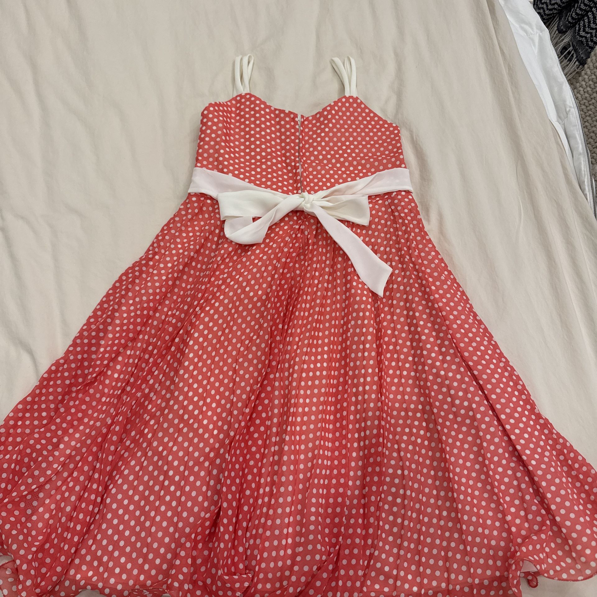 Chiffon Coral and white polka dot dress with cream bow. Never used but without tag. Kid Size 10