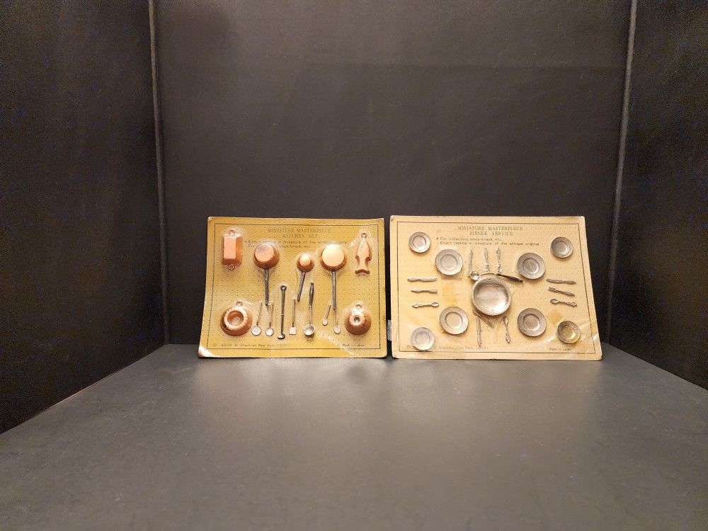 Made in Japan Shackman kitchen and dinner service sets. Dinner service set has 22 pieces, plates, knives, forks, spoons, serving bowl and ladle. This vintage set packaging has come apart, but all pieces are there. The kitchen set has 14 pieces, pots, pans, molds and utensils. Both sets are made of metal and is very similar to Germany pieces. Never been opened.