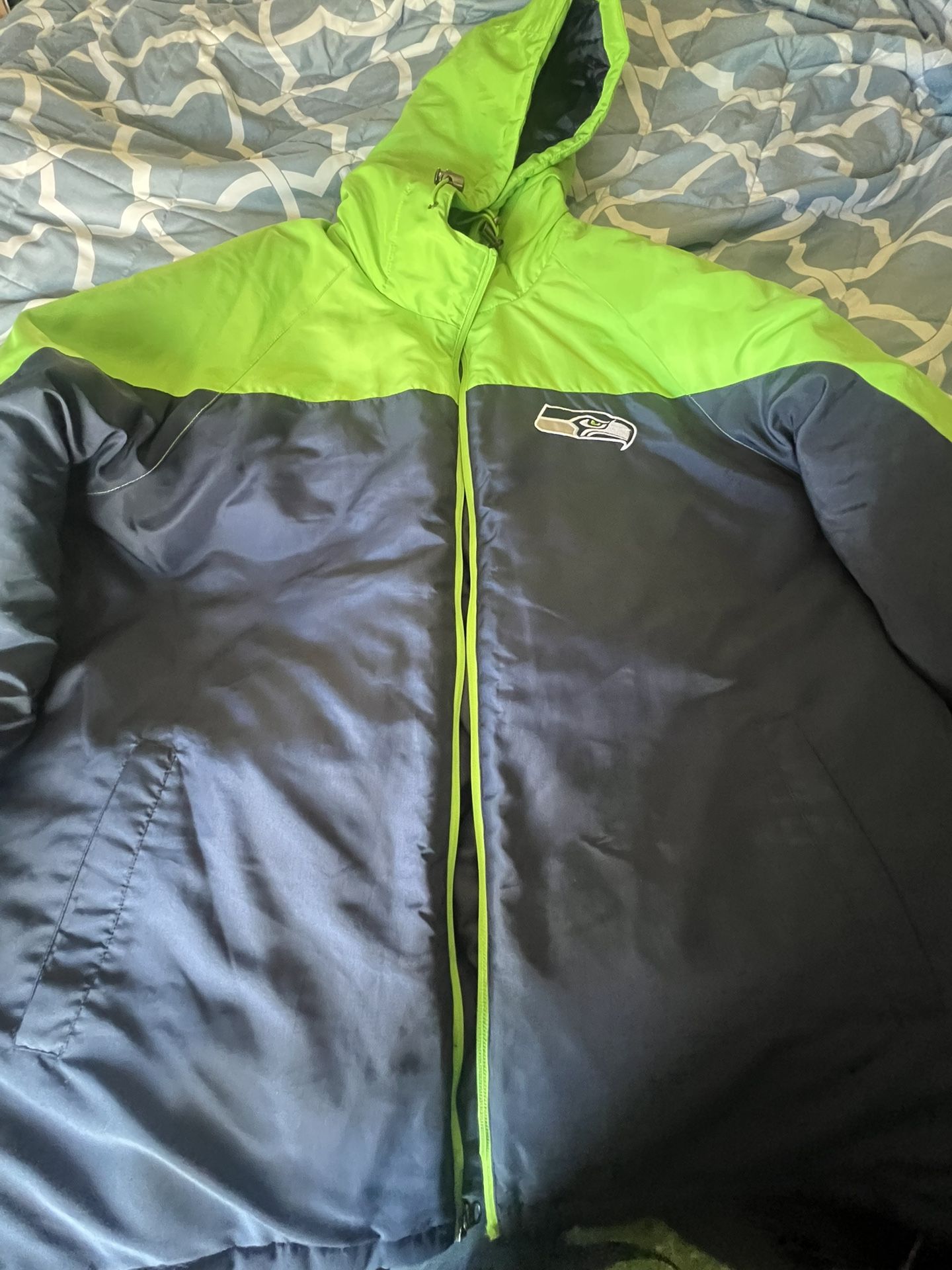 NFL Seattle Seahawks jacket it’s good for when you go to the snow. Wore it one time needs a new zipper.