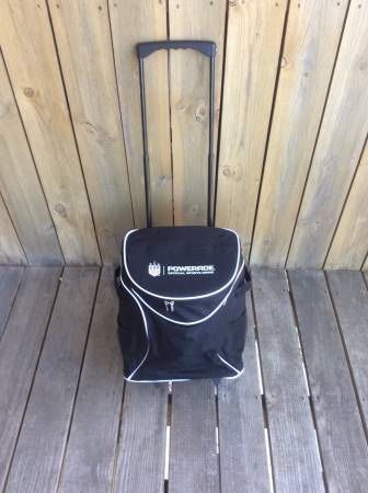 US Woman’s National Soccer Team (although there is no logo or identifying marker) rolling cooler. Never used, won from a Coca Cola / Powerade promotion. Handle and wheels similar to a rolling suitcase, soft material variety not hard material. Fits about 20 to 30 cans with ice.