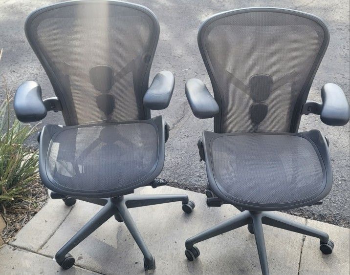Remastered Herman Miller Aeron Office Desk Chairs Fully loaded with front and back tilt lock, SL Posturefit Lumbar support and side/front sliding arm pads. Everything.... $600 each and I usually sell these for $750 Size A and B.... drafting stool versions also available for $750 Fully loaded which it means it has everything you can possibly get as features This is a remastered Aeron which is the newest version Like new Cash, Zelle, Venmo, Cash App Forward and back tilt mechanisms SL Lumbar support Side and front moving arm pads Free delivery within reason No blemishes or issues All mechanisms work perfectly