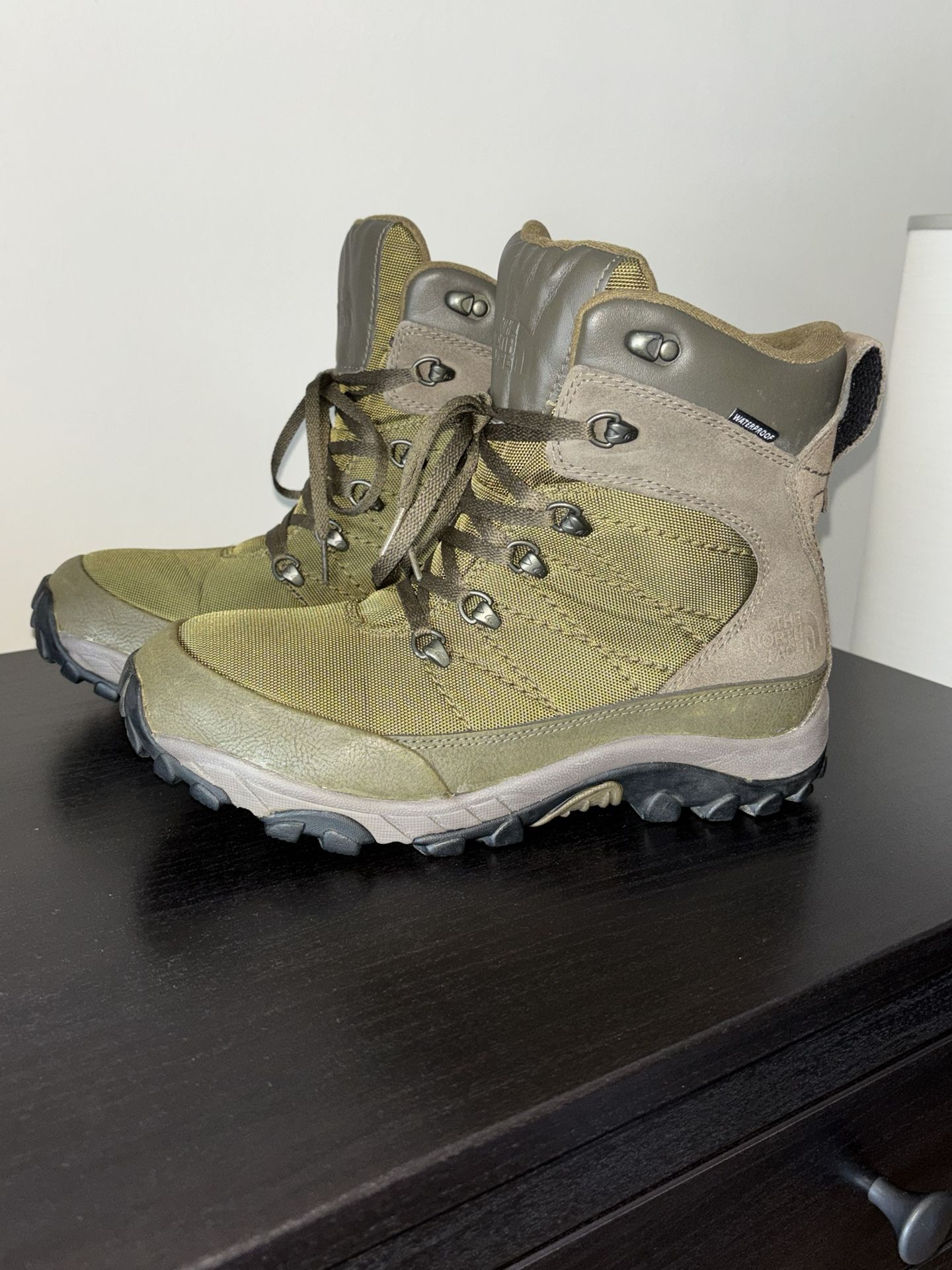 14 moths old North Face Boots, Size 8 wore them only 4 times, my foot got damaged so can’t wear them no more. Olive Green, Waterproof, very comfortable boots.