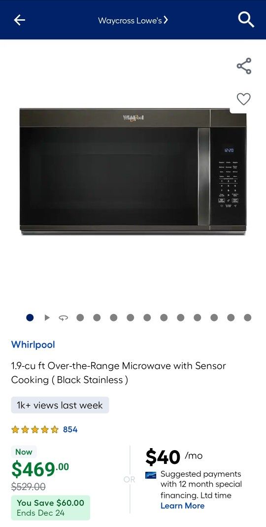 BRAND NEW IN BOX whirlpool over the range microwave with sensor cooking (black stainless) Located in west sacramento 95691. Look up lowes item number (contact info removed)