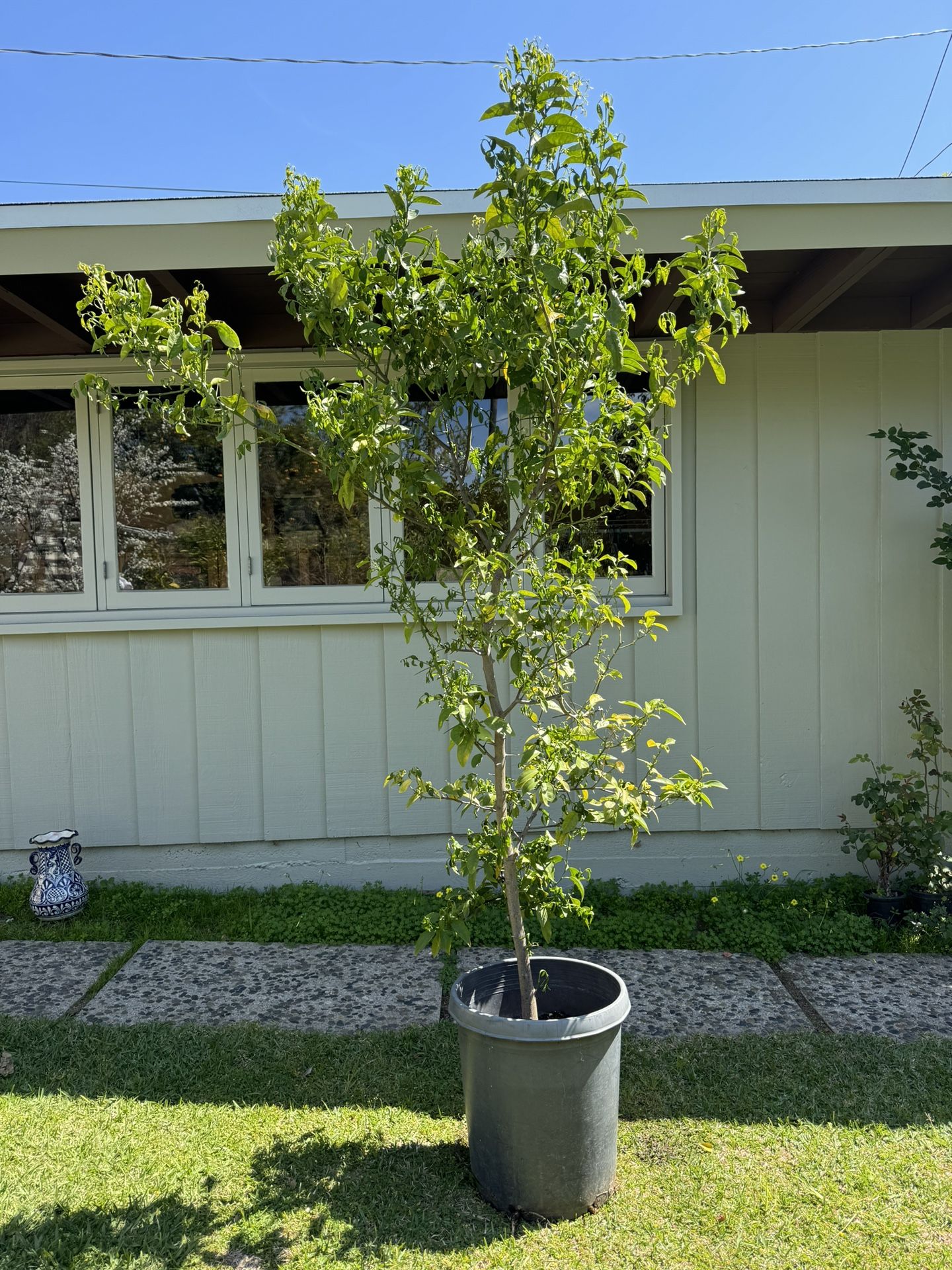 A little past 8 ft about 89 inches Has not produced foot yet can’t remember type of orange tree but it’s minimal seeds and sweet since we have one planted in our back yard that’s the same type
